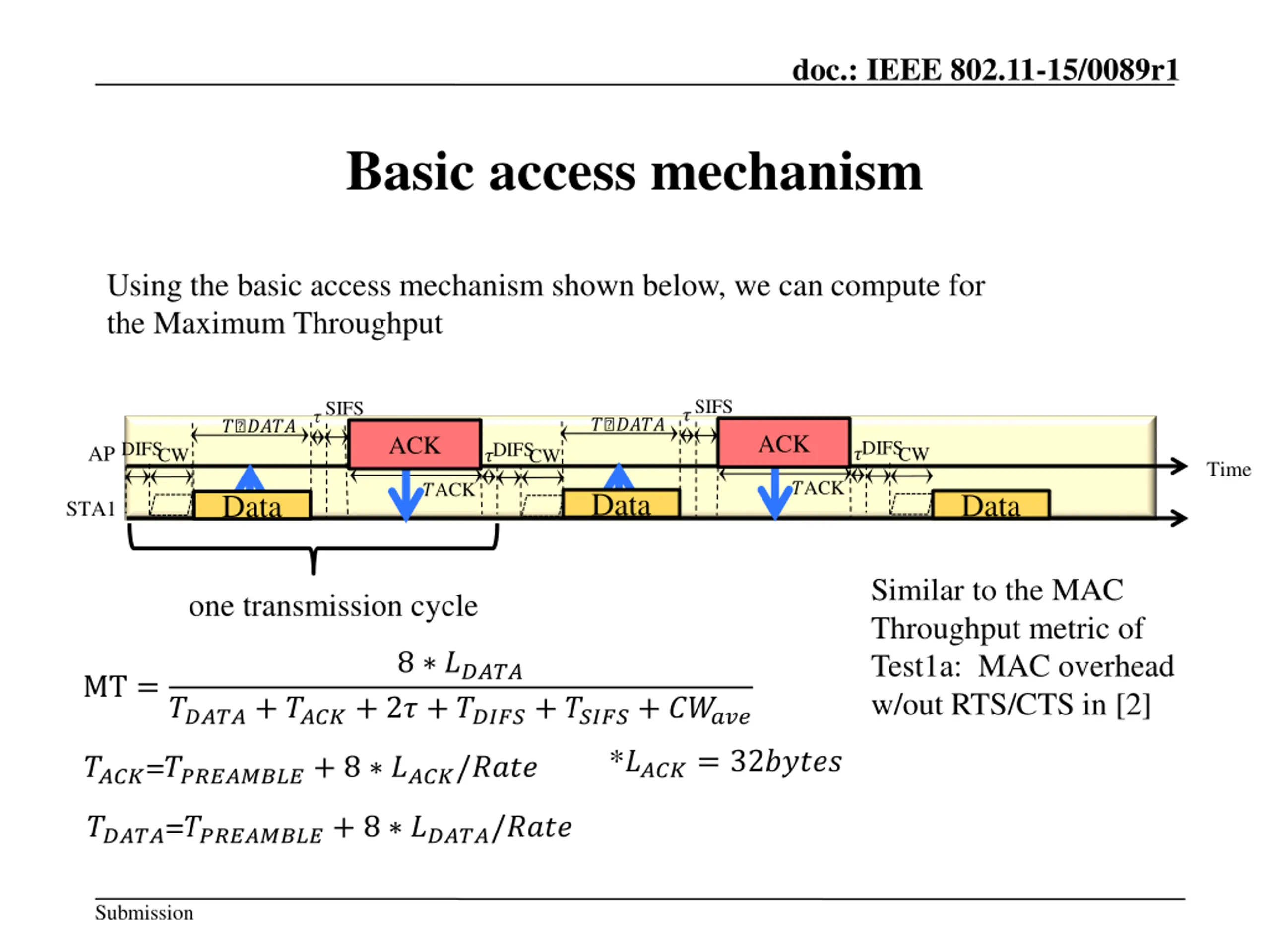 doc.: IEEE 802.11-15/0089r1 Basic access mechanism Using the basic access mechanism shown below, we can compute for the Maximum Throughput SIFS SIFS ? ? ? ???? ? ???? ACK ACK ?DIFSCW DIFSCW DIFSCW AP ? Time ?ACK ?ACK Data Data Data STA1 Similar to the MAC Throughput metric of Test1a: MAC overhead w/out RTS/CTS in [2] one transmission cycle 8 ????? MT = ?????+ ????+ 2? + ?????+ ?????+ ????? *????= 32????? ????=?????????+ 8 ????/???? ?????=?????????+ 8 ?????/???? Submission