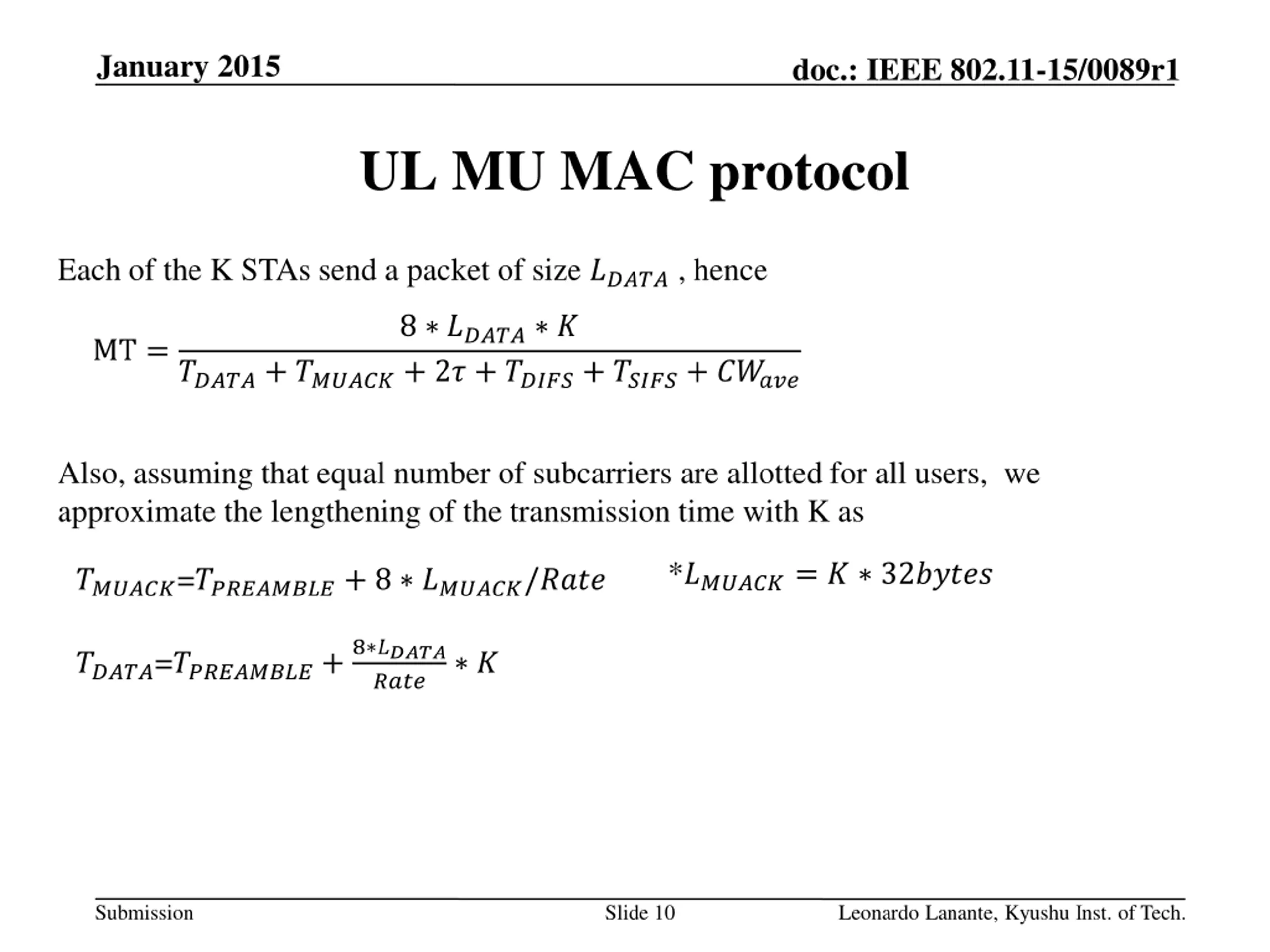 January 2015 doc.: IEEE 802.11-15/0089r1 UL MU MAC protocol Each of the K STAs send a packet of size ????? , hence 8 ????? ? MT = ?????+ ??????+ 2? + ?????+ ?????+ ????? Also, assuming that equal number of subcarriers are allotted for all users, we approximate the lengthening of the transmission time with K as *??????= ? 32????? ??????=?????????+ 8 ??????/???? ?????=?????????+8 ????? ? ???? Submission Slide 10 Leonardo Lanante, Kyushu Inst. of Tech.
