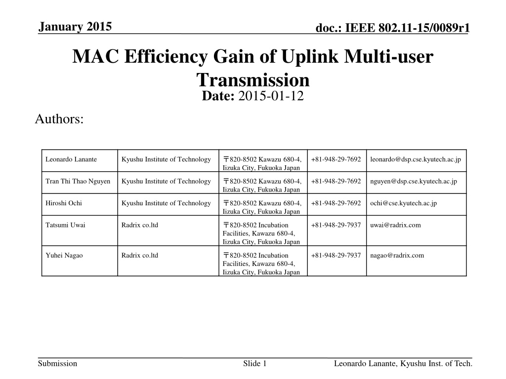 January 2015 doc.: IEEE 802.11-15/0089r1 MAC Efficiency Gain of Uplink Multi-user Transmission Date: 2015-01-12 Authors: Leonardo Lanante Kyushu Institute of Technology +81-948-29-7692 leonardo@dsp.cse.kyutech.ac.jp 820-8502 Kawazu 680-4, Iizuka City, Fukuoka Japan Tran Thi Thao Nguyen Kyushu Institute of Technology +81-948-29-7692 nguyen@dsp.cse.kyutech.ac.jp 820-8502 Kawazu 680-4, Iizuka City, Fukuoka Japan Hiroshi Ochi Kyushu Institute of Technology +81-948-29-7692 ochi@cse.kyutech.ac.jp 820-8502 Kawazu 680-4, Iizuka City, Fukuoka Japan Tatsumi Uwai Radrix co.ltd +81-948-29-7937 uwai@radrix.com 820-8502 Incubation Facilities, Kawazu 680-4, Iizuka City, Fukuoka Japan Yuhei Nagao Radrix co.ltd +81-948-29-7937 nagao@radrix.com 820-8502 Incubation Facilities, Kawazu 680-4, Iizuka City, Fukuoka Japan Submission Slide 1 Leonardo Lanante, Kyushu Inst. of Tech.