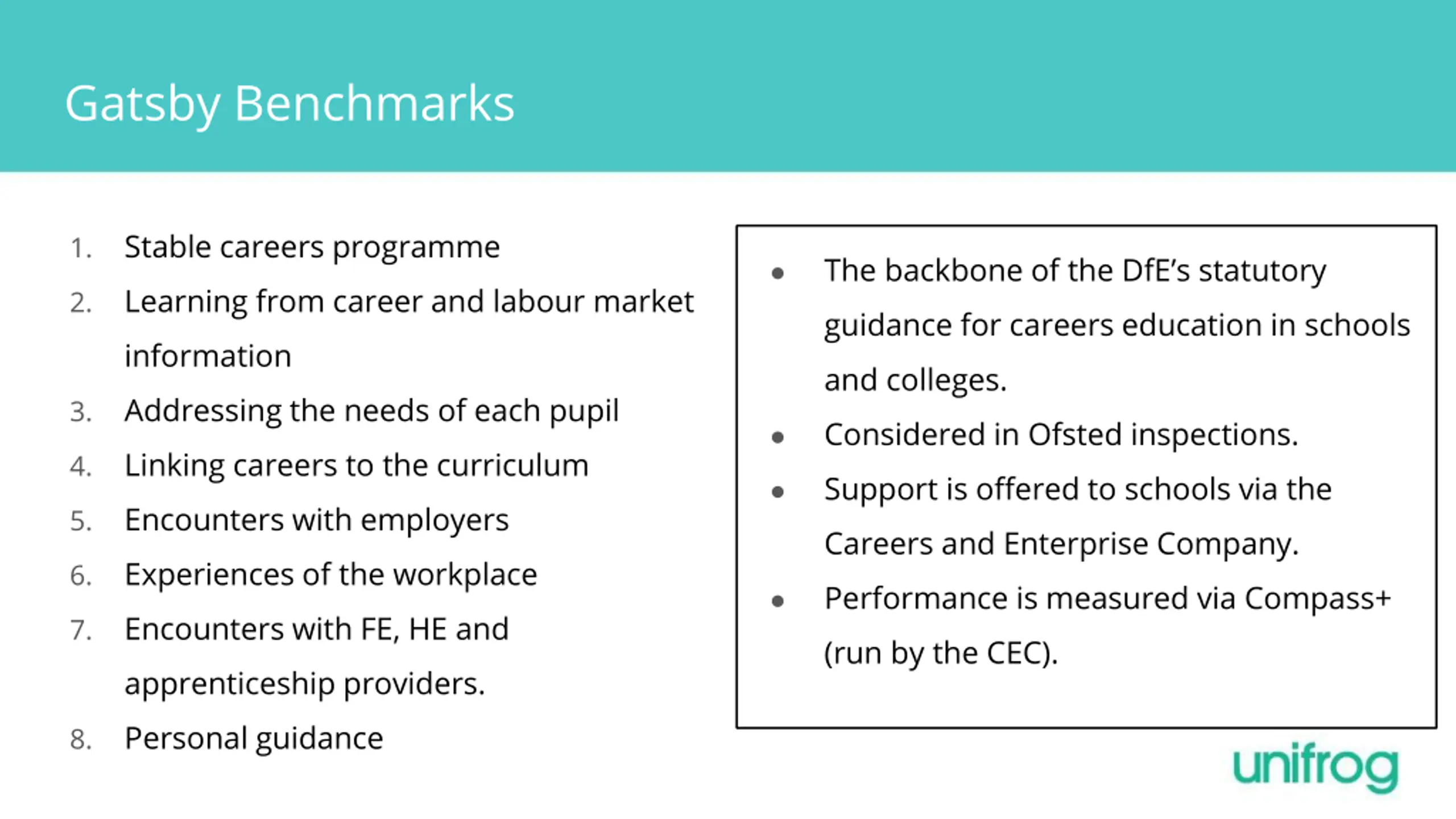 Gatsby Benchmarks Stable careers programme Learning from career and labour market information Addressing the needs of each pupil Linking careers to the curriculum Encounters with employers Experiences of the workplace Encounters with FE, HE and apprenticeship providers. Personal guidance 1. The backbone of the DfE s statutory guidance for careers education in schools and colleges. Considered in Ofsted inspections. Support is offered to schools via the Careers and Enterprise Company. Performance is measured via Compass+ (run by the CEC). 2. 3. 4. 5. 6. 7. 8.