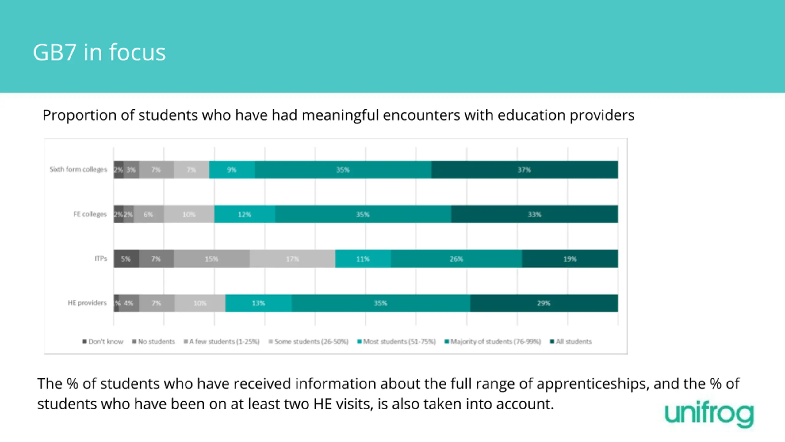 GB7 in focus Proportion of students who have had meaningful encounters with education providers The % of students who have received information about the full range of apprenticeships, and the % of students who have been on at least two HE visits, is also taken into account.