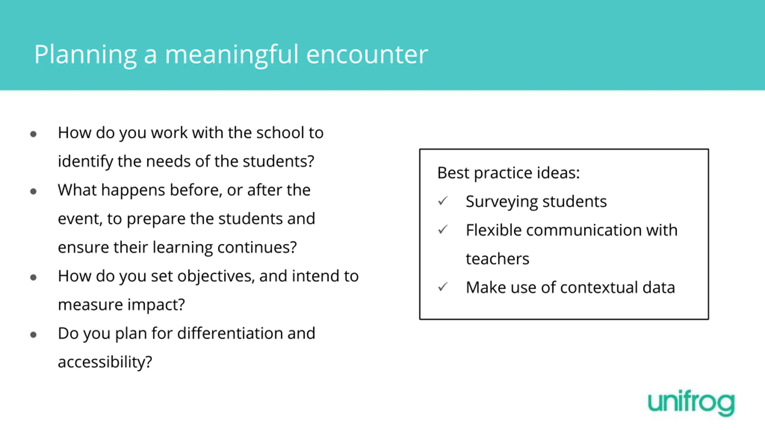 Planning a meaningful encounter How do you work with the school to identify the needs of the students? What happens before, or after the event, to prepare the students and ensure their learning continues? How do you set objectives, and intend to measure impact? Do you plan for differentiation and accessibility? Best practice ideas: Surveying students Flexible communication with teachers Make use of contextual data