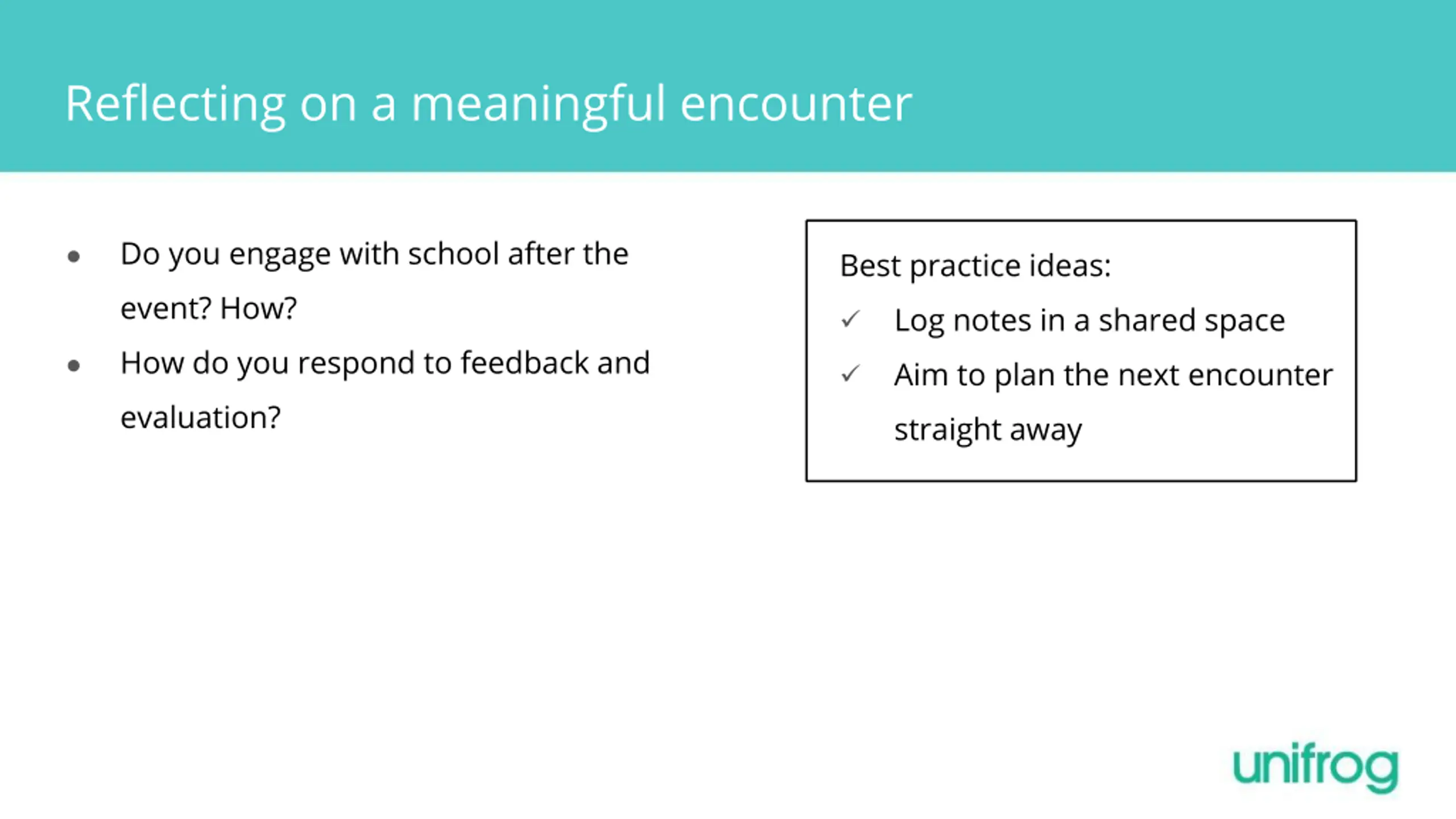 Reflecting on a meaningful encounter Do you engage with school after the event? How? How do you respond to feedback and evaluation? Best practice ideas: Log notes in a shared space Aim to plan the next encounter straight away