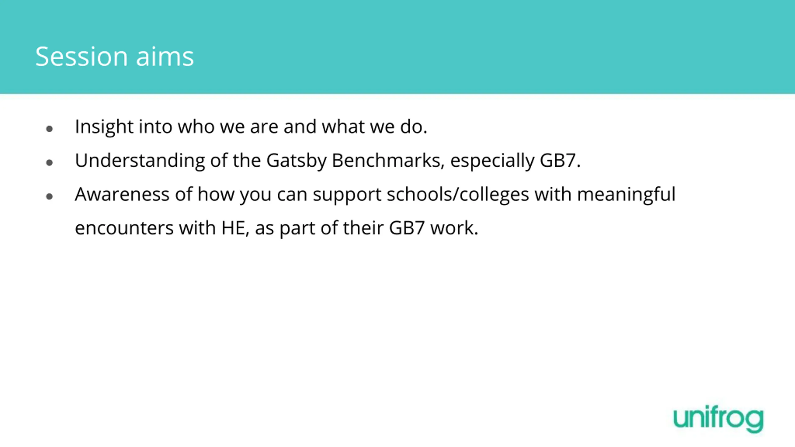 Session aims Insight into who we are and what we do. Understanding of the Gatsby Benchmarks, especially GB7. Awareness of how you can support schools/colleges with meaningful encounters with HE, as part of their GB7 work.