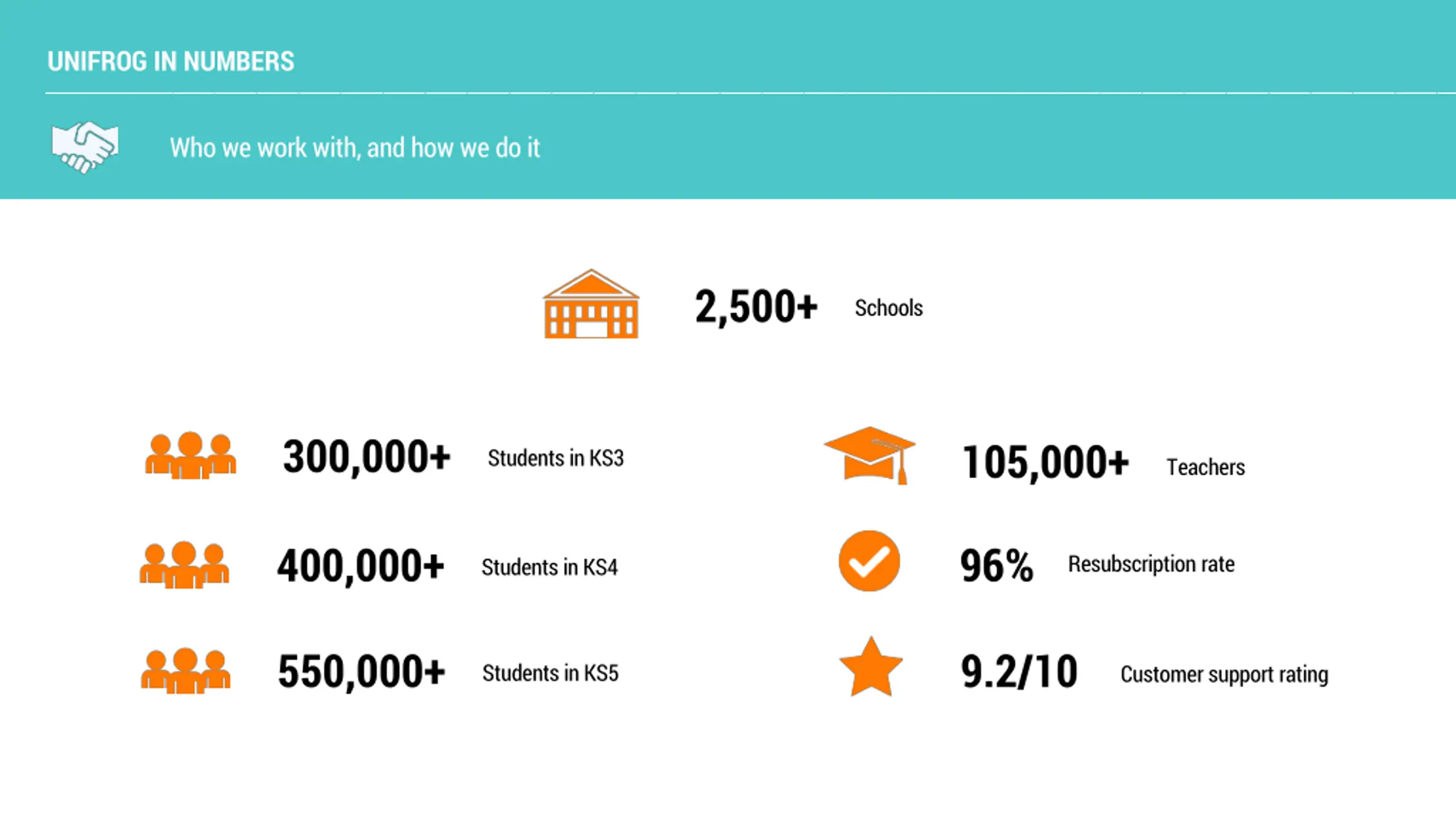 UNIFROG IN NUMBERS Who we work with, and how we do it 2,500+ Schools 300,000+ 105,000+ Students in KS3 Teachers 400,000+ 96% Resubscription rate Students in KS4 550,000+ 9.2/10 Students in KS5 Customer support rating