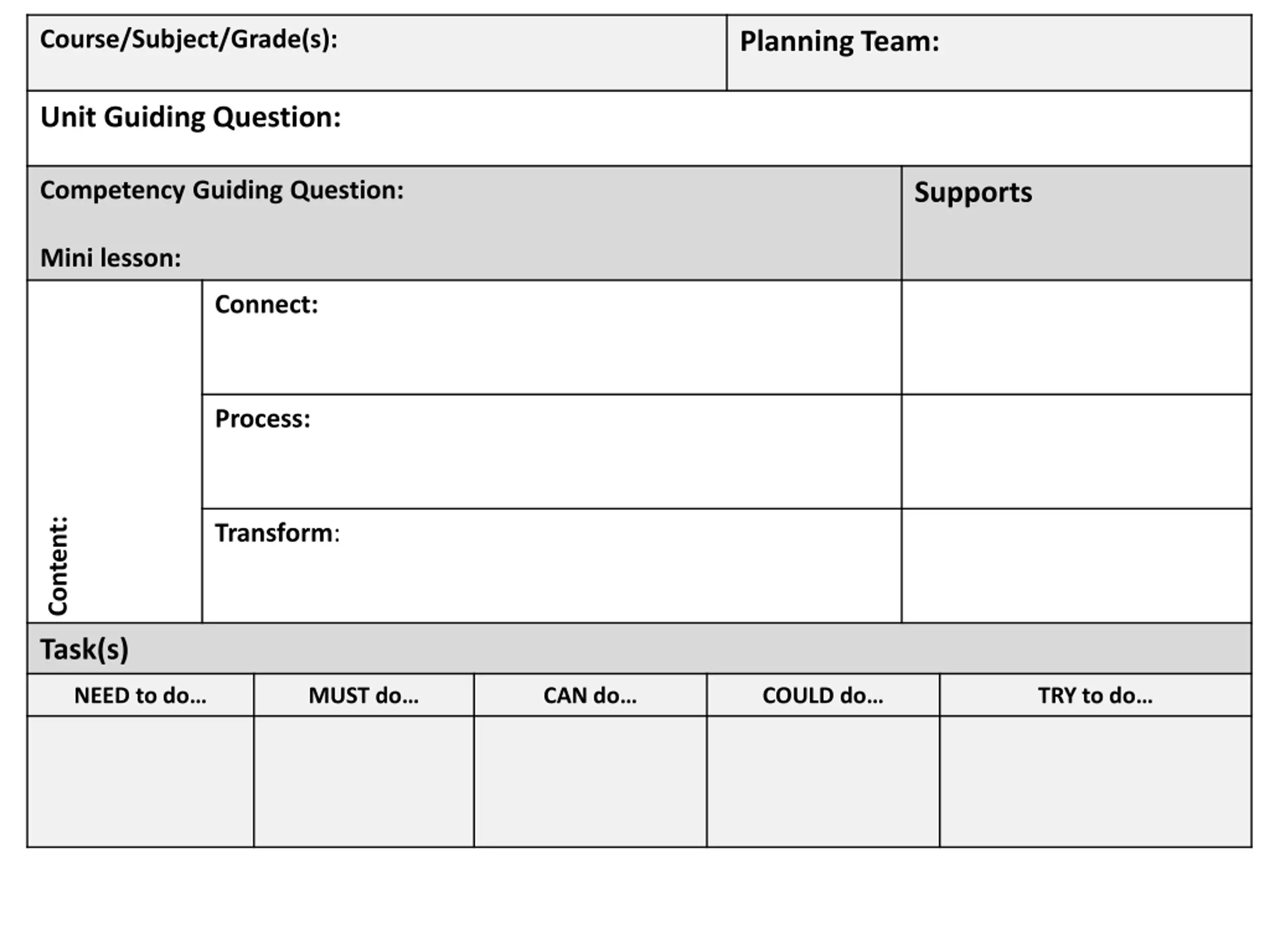 Course/Subject/Grade(s): Planning Team: Unit Guiding Question: Competency Guiding Question: Supports Mini lesson: Connect: Process: Content: Transform: Task(s) NEED to do MUST do CAN do COULD do TRY to do