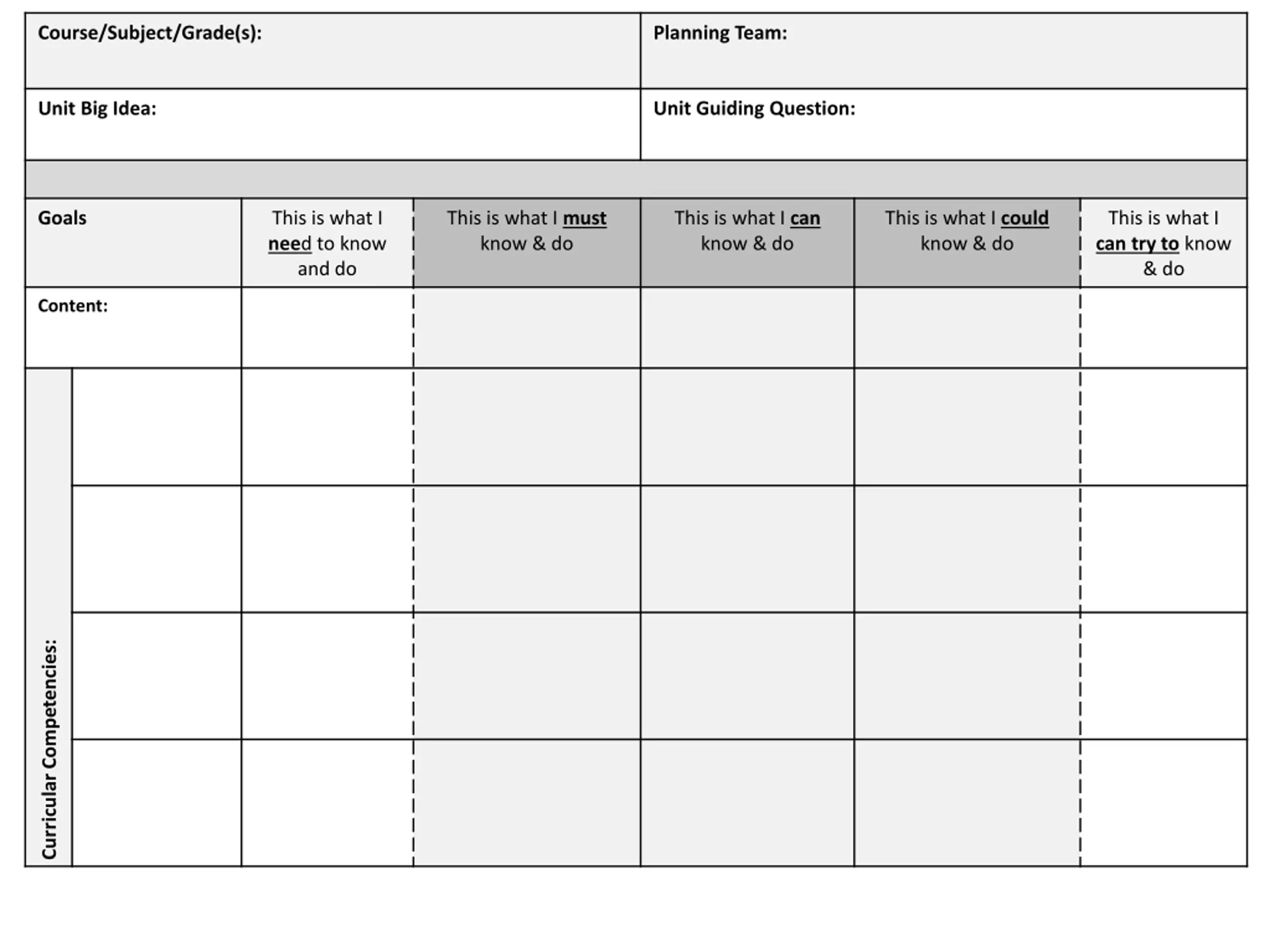 Course/Subject/Grade(s): Planning Team: Unit Big Idea: Unit Guiding Question: Goals This is what I need to know and do This is what I must know & do This is what I can know & do This is what I could know & do This is what I can try to know & do Content: Curricular Competencies: