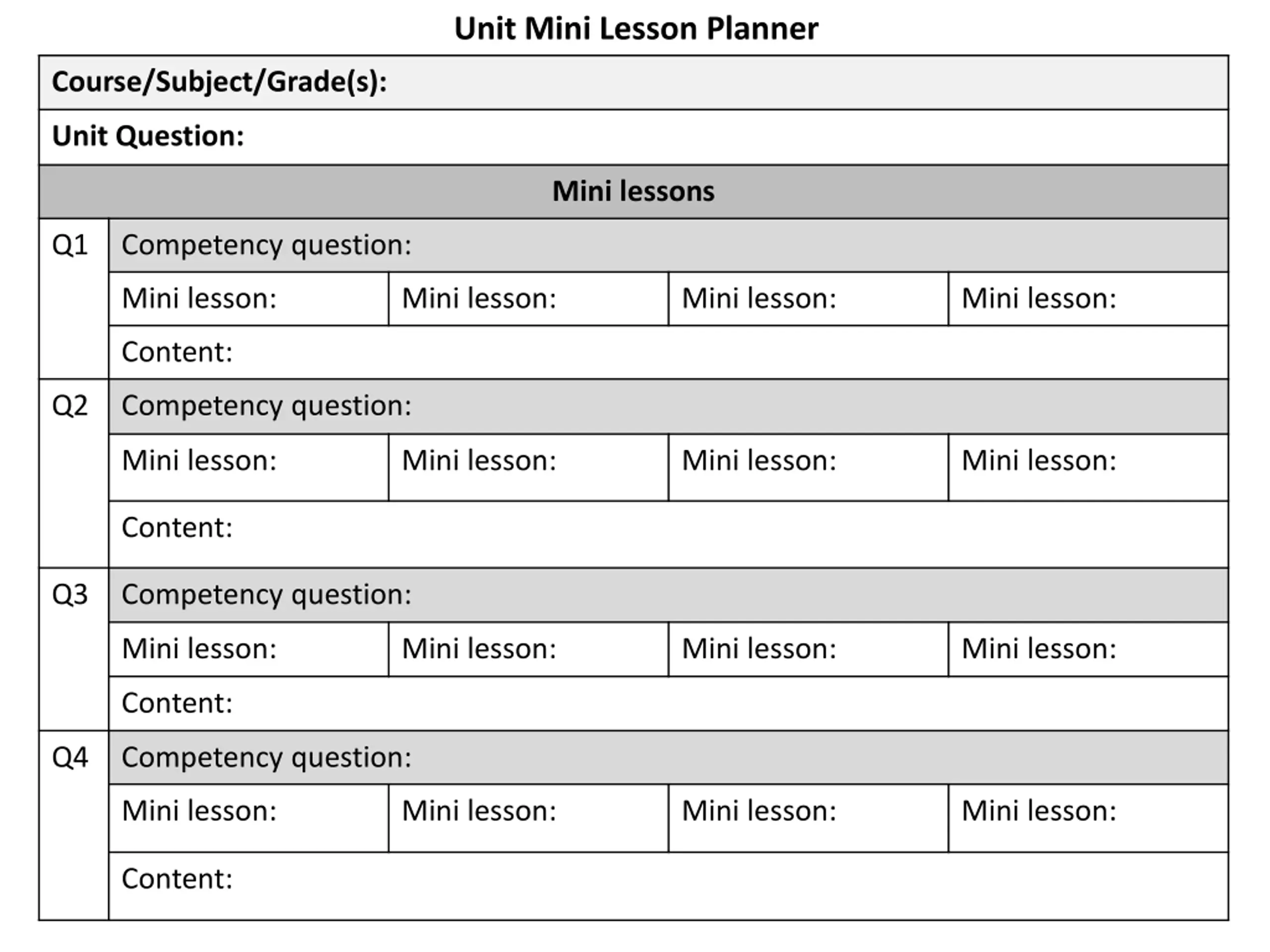 Unit Mini Lesson Planner Course/Subject/Grade(s): Unit Question: Mini lessons Q1 Competency question: Mini lesson: Mini lesson: Mini lesson: Mini lesson: Content: Q2 Competency question: Mini lesson: Mini lesson: Mini lesson: Mini lesson: Content: Q3 Competency question: Mini lesson: Mini lesson: Mini lesson: Mini lesson: Content: Q4 Competency question: Mini lesson: Mini lesson: Mini lesson: Mini lesson: Content: