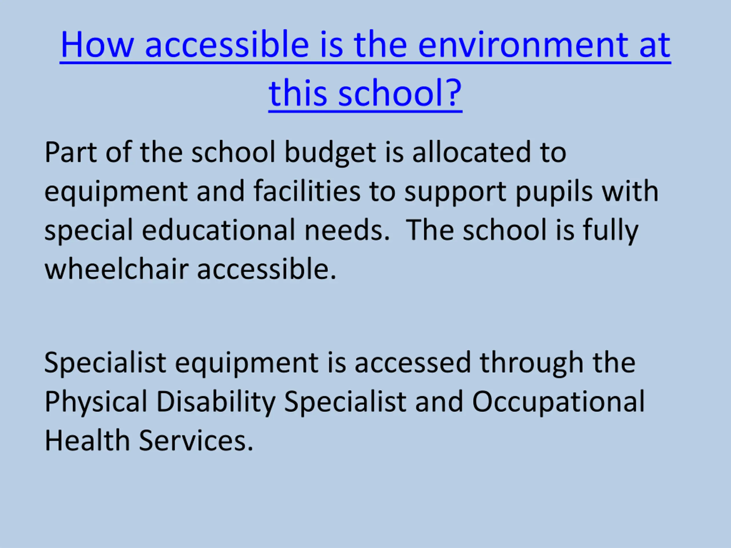 How accessible is the environment at this school? Part of the school budget is allocated to equipment and facilities to support pupils with special educational needs. The school is fully wheelchair accessible. Specialist equipment is accessed through the Physical Disability Specialist and Occupational Health Services.