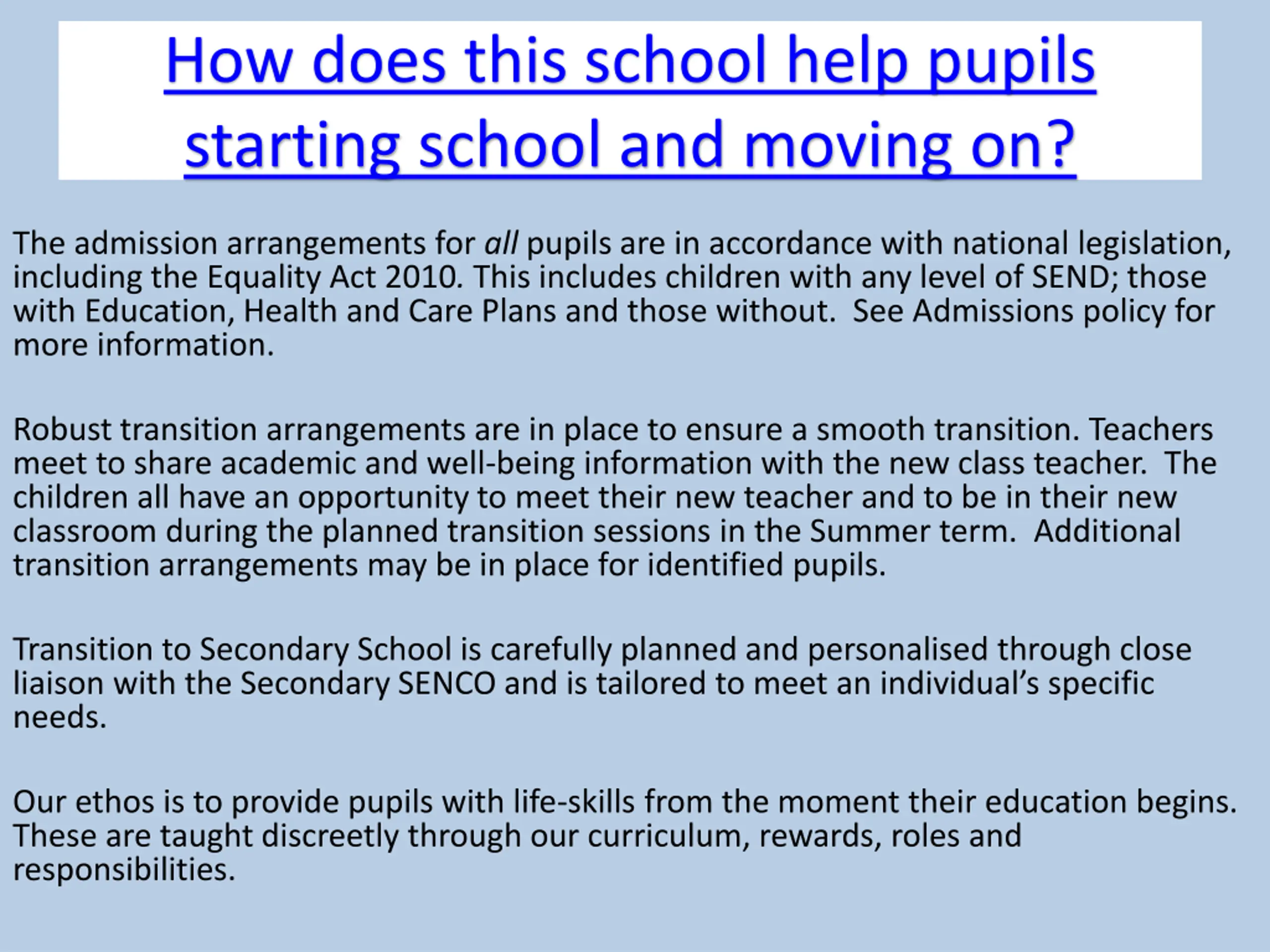 How does this school help pupils starting school and moving on? The admission arrangements for all pupils are in accordance with national legislation, including the Equality Act 2010. This includes children with any level of SEND; those with Education, Health and Care Plans and those without. See Admissions policy for more information. Robust transition arrangements are in place to ensure a smooth transition. Teachers meet to share academic and well-being information with the new class teacher. The children all have an opportunity to meet their new teacher and to be in their new classroom during the planned transition sessions in the Summer term. Additional transition arrangements may be in place for identified pupils. Transition to Secondary School is carefully planned and personalised through close liaison with the Secondary SENCO and is tailored to meet an individual s specific needs. Our ethos is to provide pupils with life-skills from the moment their education begins. These are taught discreetly through our curriculum, rewards, roles and responsibilities.