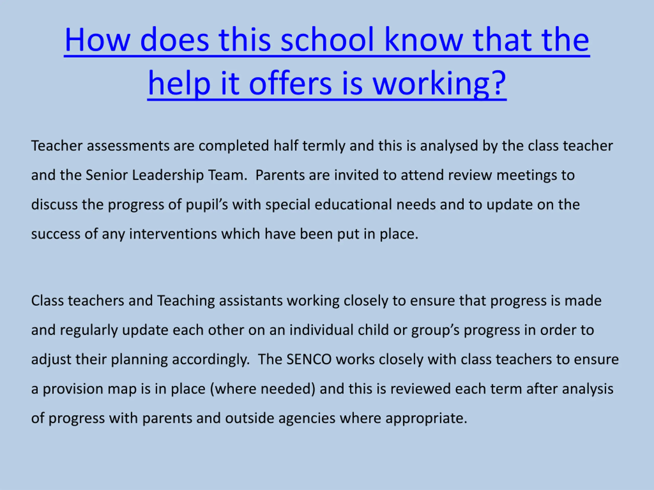 How does this school know that the help it offers is working? Teacher assessments are completed half termly and this is analysed by the class teacher and the Senior Leadership Team. Parents are invited to attend review meetings to discuss the progress of pupil s with special educational needs and to update on the success of any interventions which have been put in place. Class teachers and Teaching assistants working closely to ensure that progress is made and regularly update each other on an individual child or group s progress in order to adjust their planning accordingly. The SENCO works closely with class teachers to ensure a provision map is in place (where needed) and this is reviewed each term after analysis of progress with parents and outside agencies where appropriate.