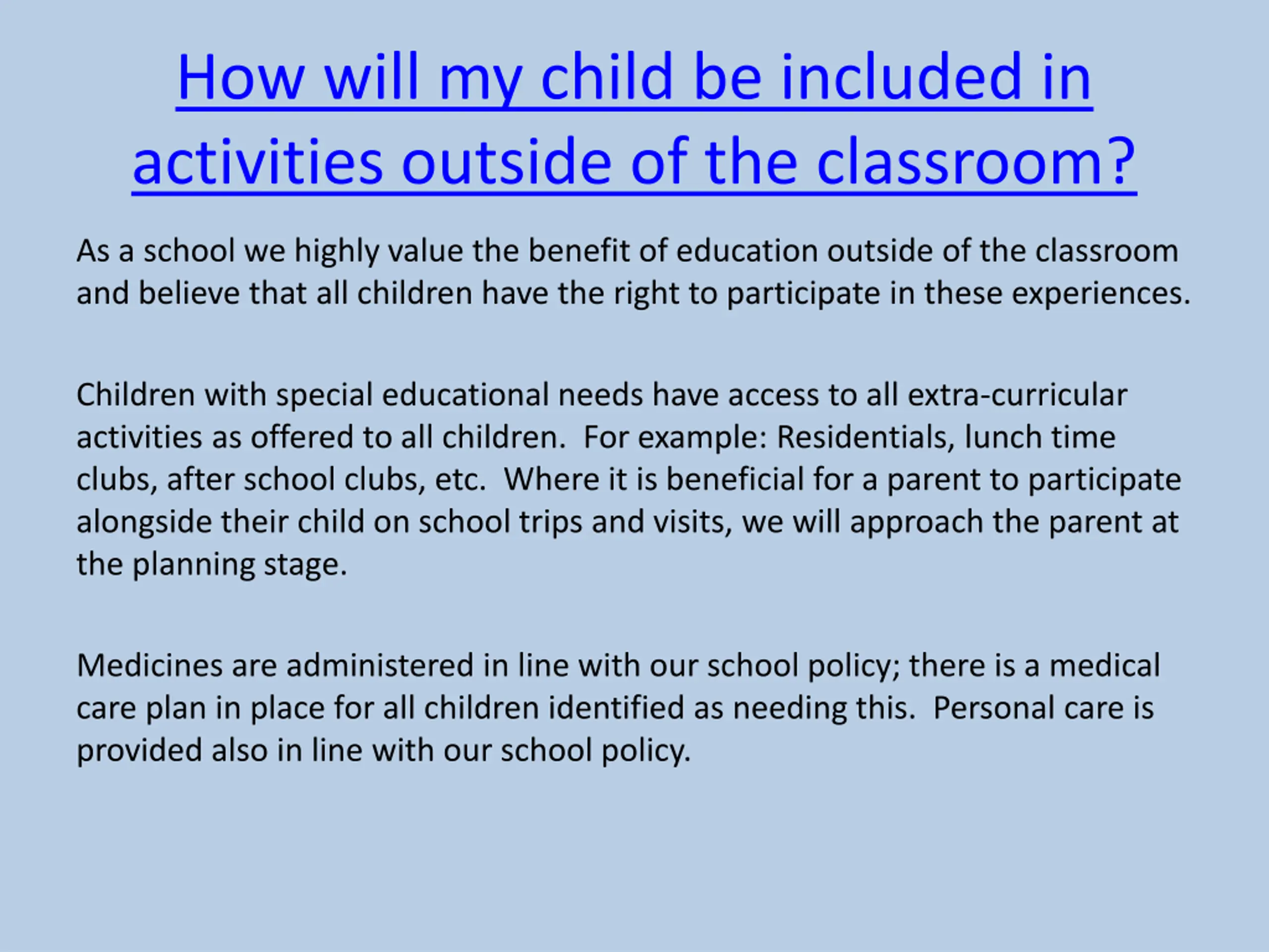 How will my child be included in activities outside of the classroom? As a school we highly value the benefit of education outside of the classroom and believe that all children have the right to participate in these experiences. Children with special educational needs have access to all extra-curricular activities as offered to all children. For example: Residentials, lunch time clubs, after school clubs, etc. Where it is beneficial for a parent to participate alongside their child on school trips and visits, we will approach the parent at the planning stage. Medicines are administered in line with our school policy; there is a medical care plan in place for all children identified as needing this. Personal care is provided also in line with our school policy.