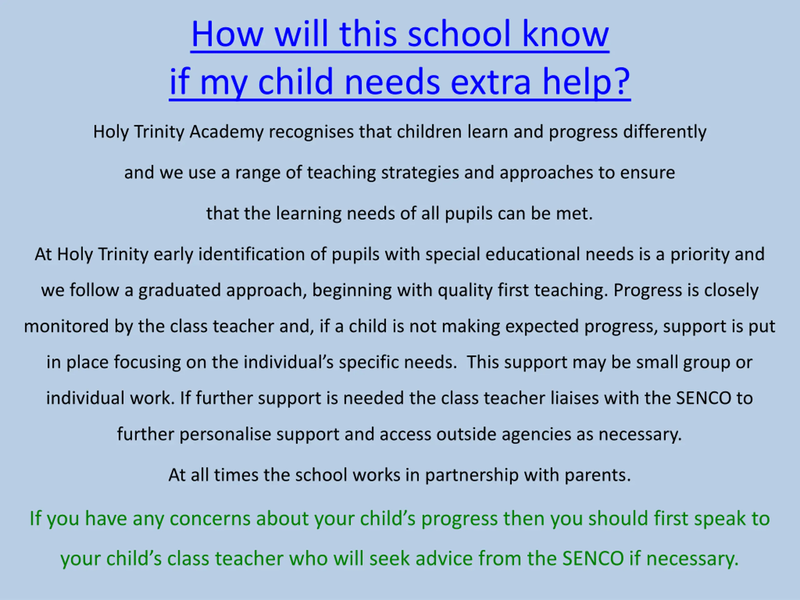 How will this school know if my child needs extra help? Holy Trinity Academy recognises that children learn and progress differently and we use a range of teaching strategies and approaches to ensure that the learning needs of all pupils can be met. At Holy Trinity early identification of pupils with special educational needs is a priority and we follow a graduated approach, beginning with quality first teaching. Progress is closely monitored by the class teacher and, if a child is not making expected progress, support is put in place focusing on the individual s specific needs. This support may be small group or individual work. If further support is needed the class teacher liaises with the SENCO to further personalise support and access outside agencies as necessary. At all times the school works in partnership with parents. If you have any concerns about your child s progress then you should first speak to your child s class teacher who will seek advice from the SENCO if necessary.