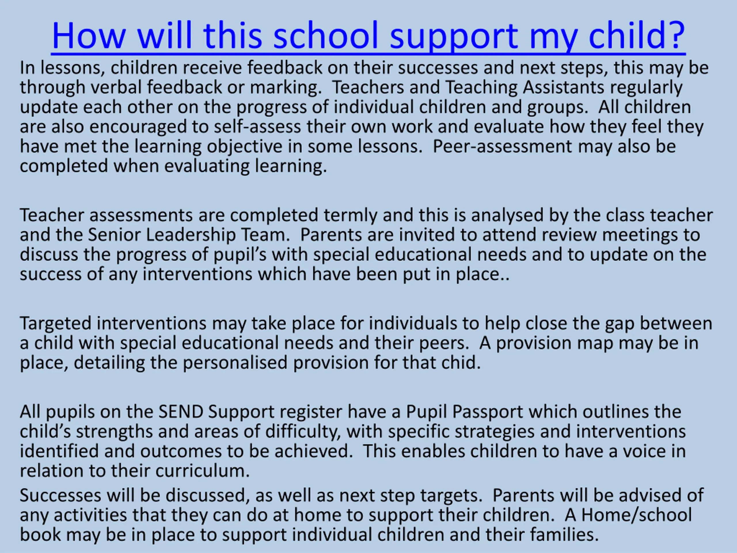 How will this school support my child? In lessons, children receive feedback on their successes and next steps, this may be through verbal feedback or marking. Teachers and Teaching Assistants regularly update each other on the progress of individual children and groups. All children are also encouraged to self-assess their own work and evaluate how they feel they have met the learning objective in some lessons. Peer-assessment may also be completed when evaluating learning. Teacher assessments are completed termly and this is analysed by the class teacher and the Senior Leadership Team. Parents are invited to attend review meetings to discuss the progress of pupil s with special educational needs and to update on the success of any interventions which have been put in place.. Targeted interventions may take place for individuals to help close the gap between a child with special educational needs and their peers. A provision map may be in place, detailing the personalised provision for that chid. All pupils on the SEND Support register have a Pupil Passport which outlines the child s strengths and areas of difficulty, with specific strategies and interventions identified and outcomes to be achieved. This enables children to have a voice in relation to their curriculum. Successes will be discussed, as well as next step targets. Parents will be advised of any activities that they can do at home to support their children. A Home/school book may be in place to support individual children and their families.