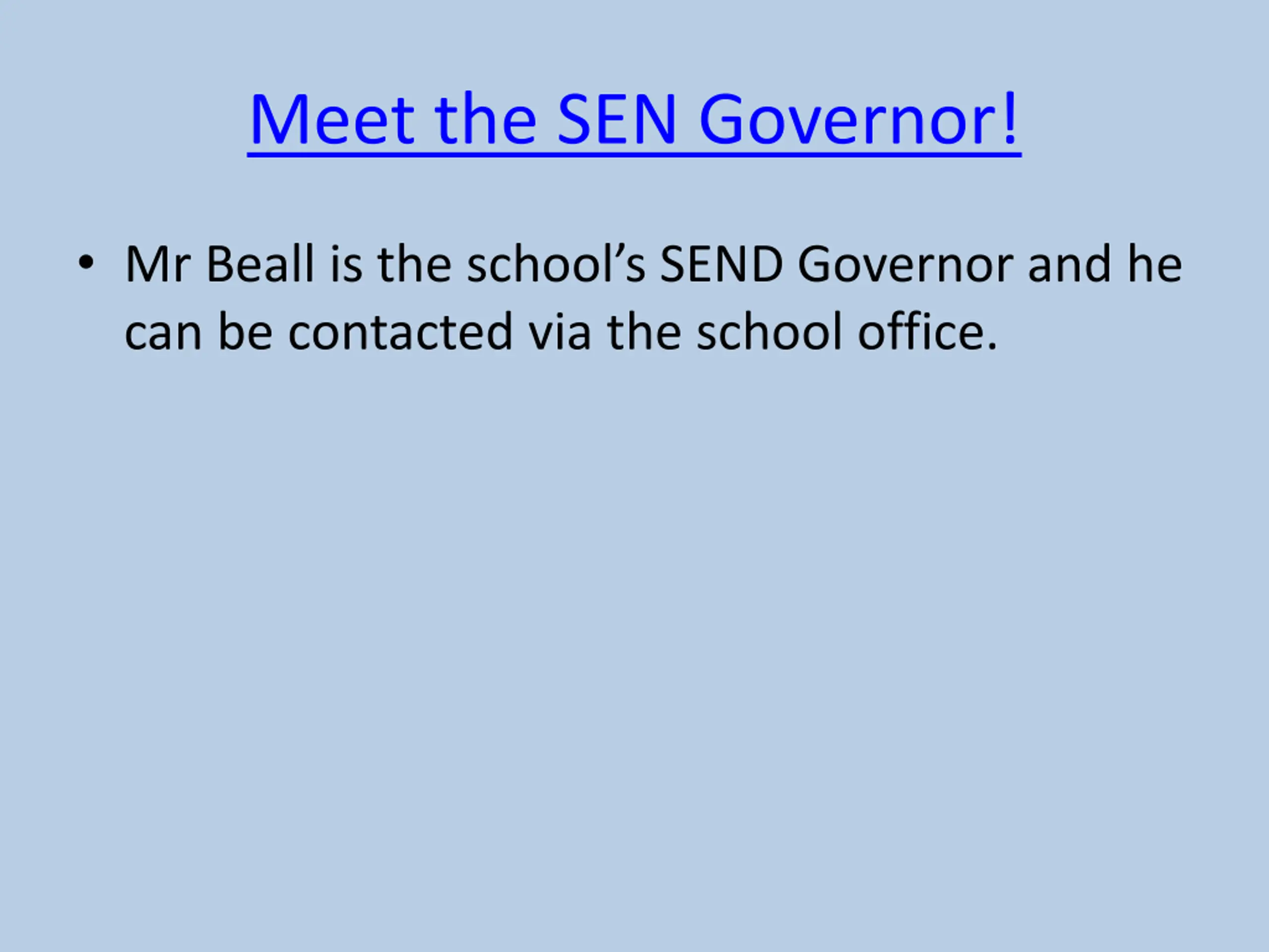 Meet the SEN Governor! Mr Beall is the school s SEND Governor and he can be contacted via the school office.