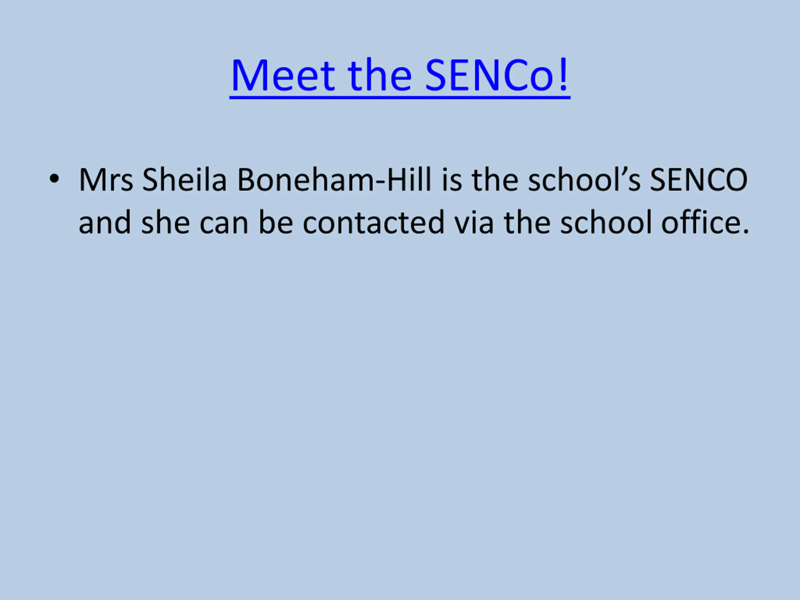 Meet the SENCo! Mrs Sheila Boneham-Hill is the school s SENCO and she can be contacted via the school office.