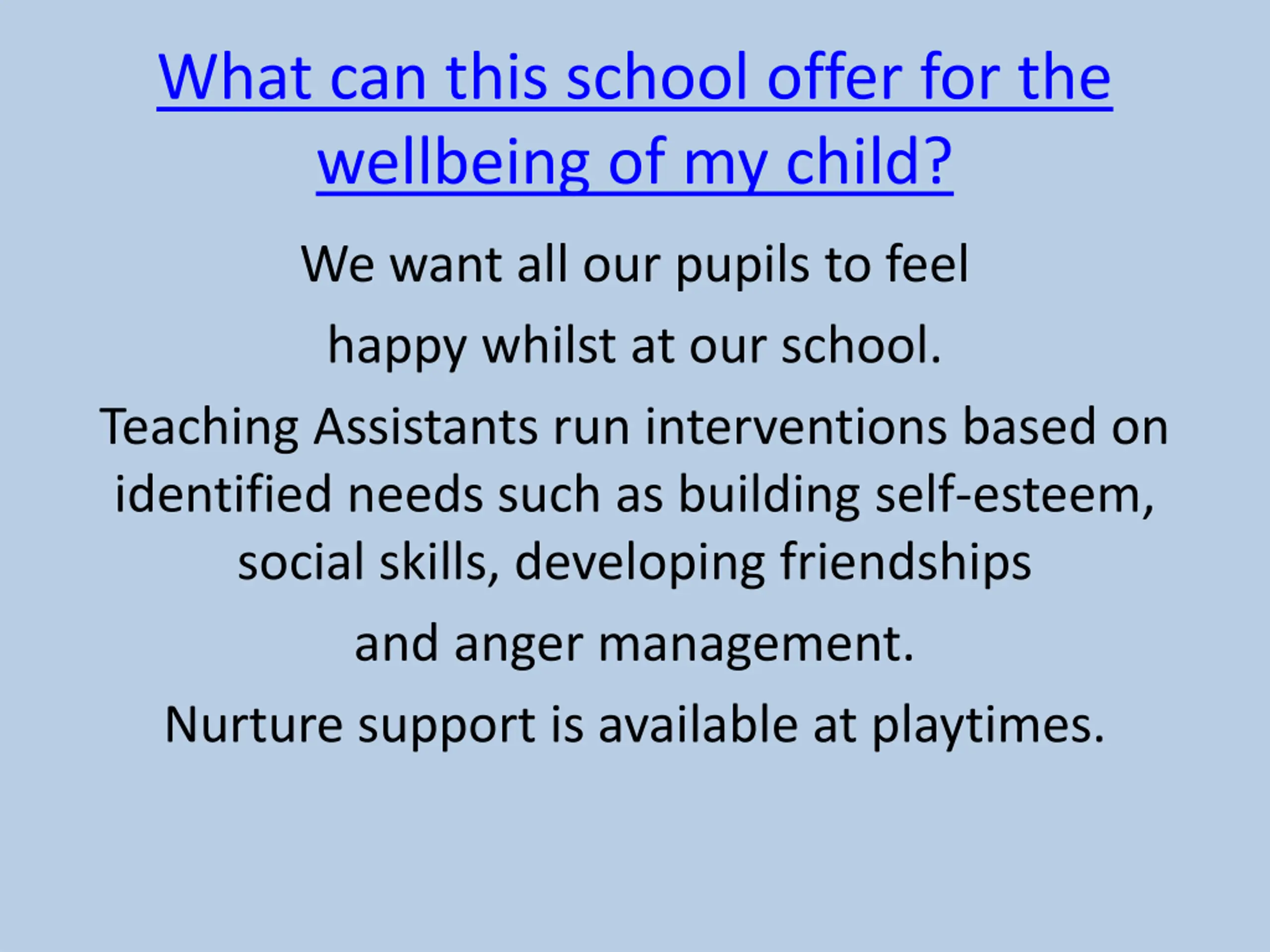 What can this school offer for the wellbeing of my child? We want all our pupils to feel happy whilst at our school. Teaching Assistants run interventions based on identified needs such as building self-esteem, social skills, developing friendships and anger management. Nurture support is available at playtimes.