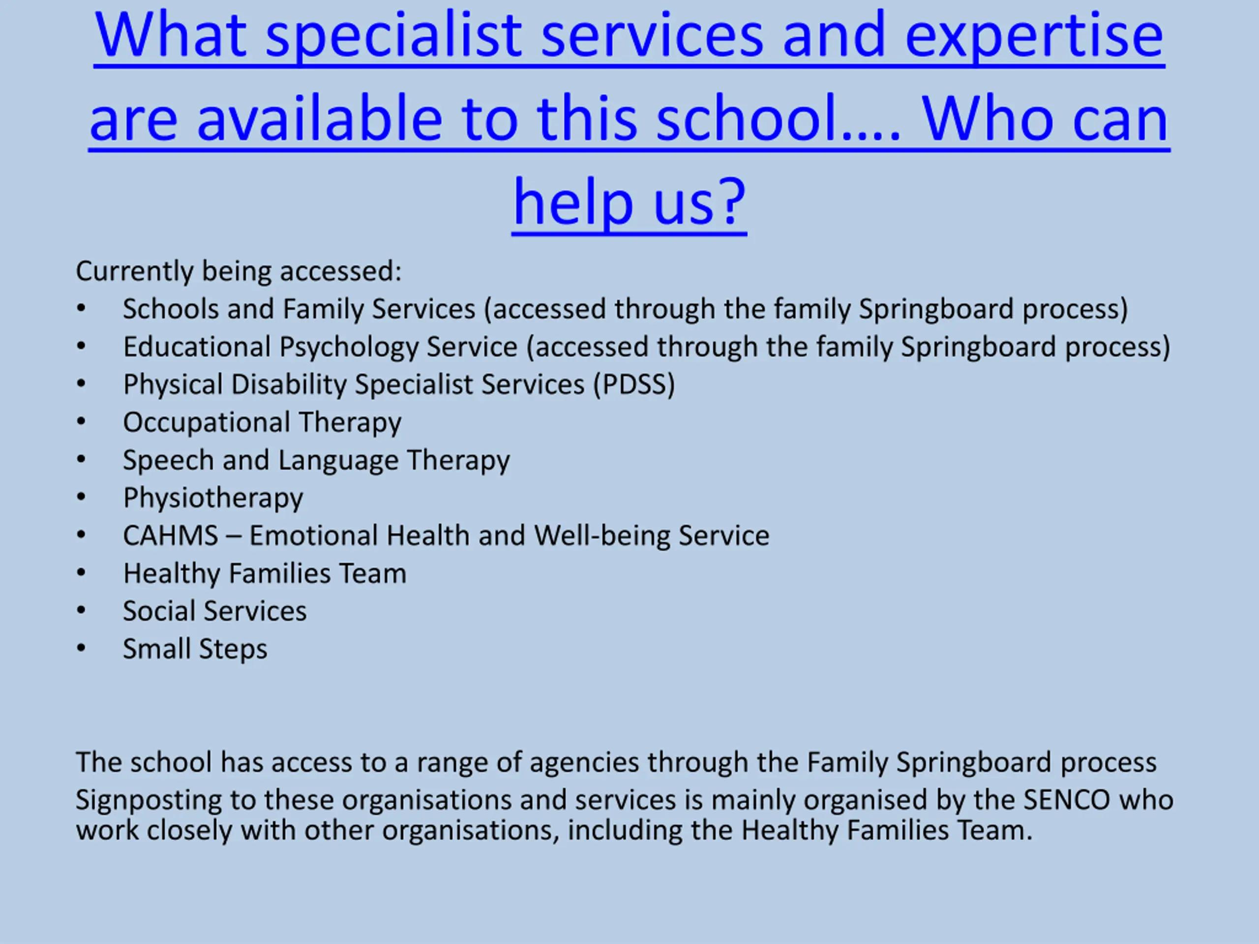What specialist services and expertise are available to this school . Who can help us? Currently being accessed: Schools and Family Services (accessed through the family Springboard process) Educational Psychology Service (accessed through the family Springboard process) Physical Disability Specialist Services (PDSS) Occupational Therapy Speech and Language Therapy Physiotherapy CAHMS Emotional Health and Well-being Service Healthy Families Team Social Services Small Steps The school has access to a range of agencies through the Family Springboard process Signposting to these organisations and services is mainly organised by the SENCO who work closely with other organisations, including the Healthy Families Team.