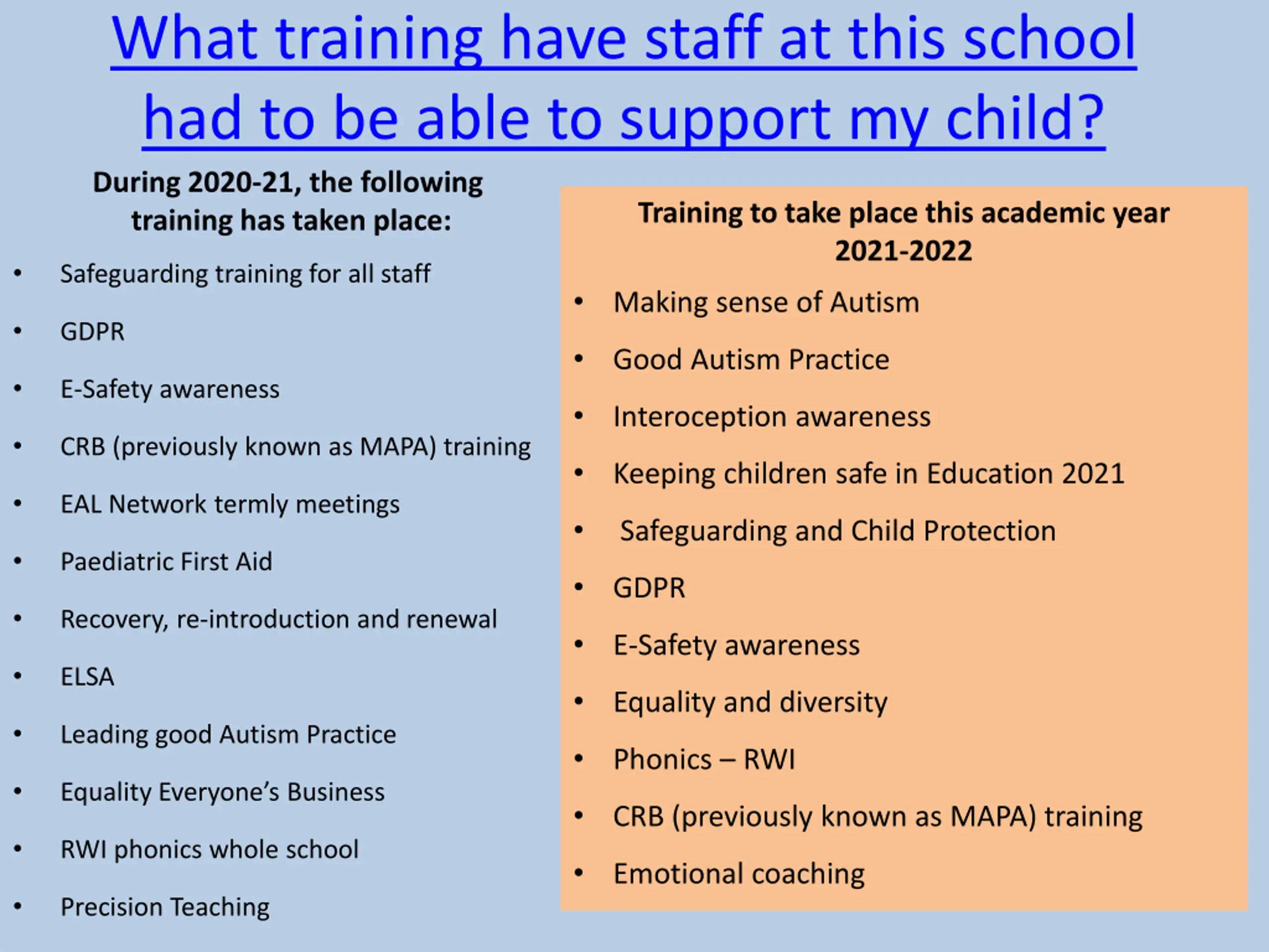 What training have staff at this school had to be able to support my child? During 2020-21, the following training has taken place: Training to take place this academic year 2021-2022 Safeguarding training for all staff Making sense of Autism GDPR Good Autism Practice E-Safety awareness Interoception awareness CRB (previously known as MAPA) training Keeping children safe in Education 2021 EAL Network termly meetings Safeguarding and Child Protection Paediatric First Aid GDPR Recovery, re-introduction and renewal E-Safety awareness ELSA Equality and diversity Leading good Autism Practice Phonics RWI Equality Everyone s Business CRB (previously known as MAPA) training RWI phonics whole school Emotional coaching Precision Teaching