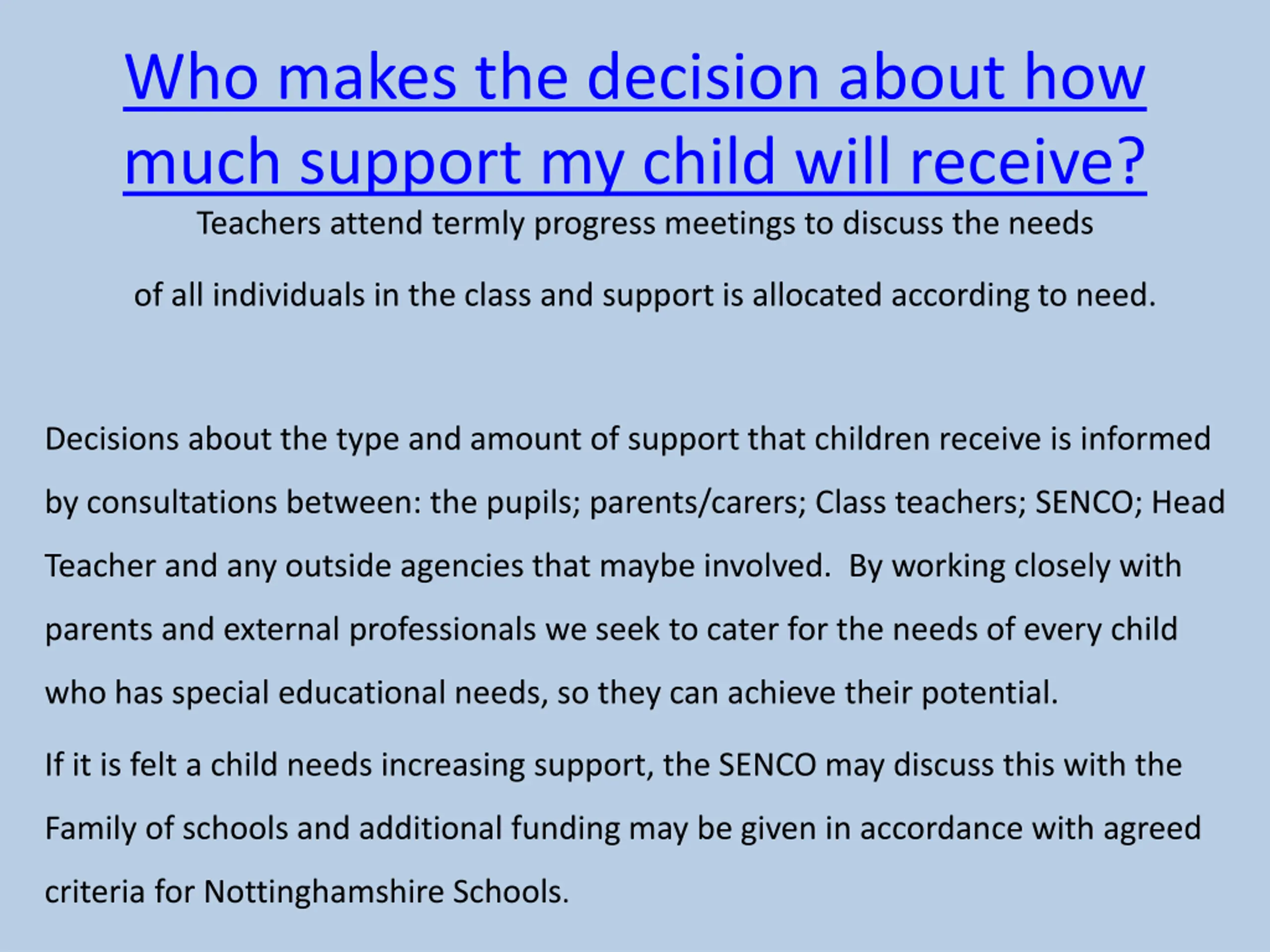 Who makes the decision about how much support my child will receive? Teachers attend termly progress meetings to discuss the needs of all individuals in the class and support is allocated according to need. Decisions about the type and amount of support that children receive is informed by consultations between: the pupils; parents/carers; Class teachers; SENCO; Head Teacher and any outside agencies that maybe involved. By working closely with parents and external professionals we seek to cater for the needs of every child who has special educational needs, so they can achieve their potential. If it is felt a child needs increasing support, the SENCO may discuss this with the Family of schools and additional funding may be given in accordance with agreed criteria for Nottinghamshire Schools.
