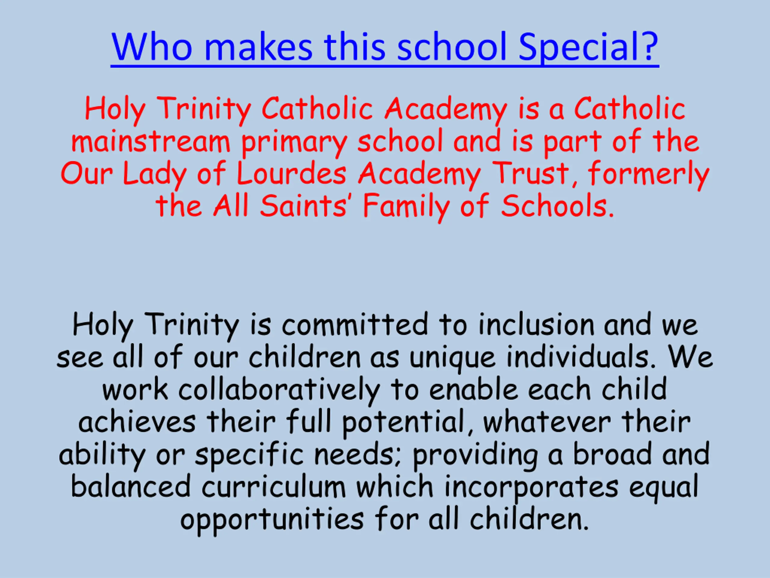 Who makes this school Special? Holy Trinity Catholic Academy is a Catholic mainstream primary school and is part of the Our Lady of Lourdes Academy Trust, formerly the All Saints Family of Schools. Holy Trinity is committed to inclusion and we see all of our children as unique individuals. We work collaboratively to enable each child achieves their full potential, whatever their ability or specific needs; providing a broad and balanced curriculum which incorporates equal opportunities for all children.