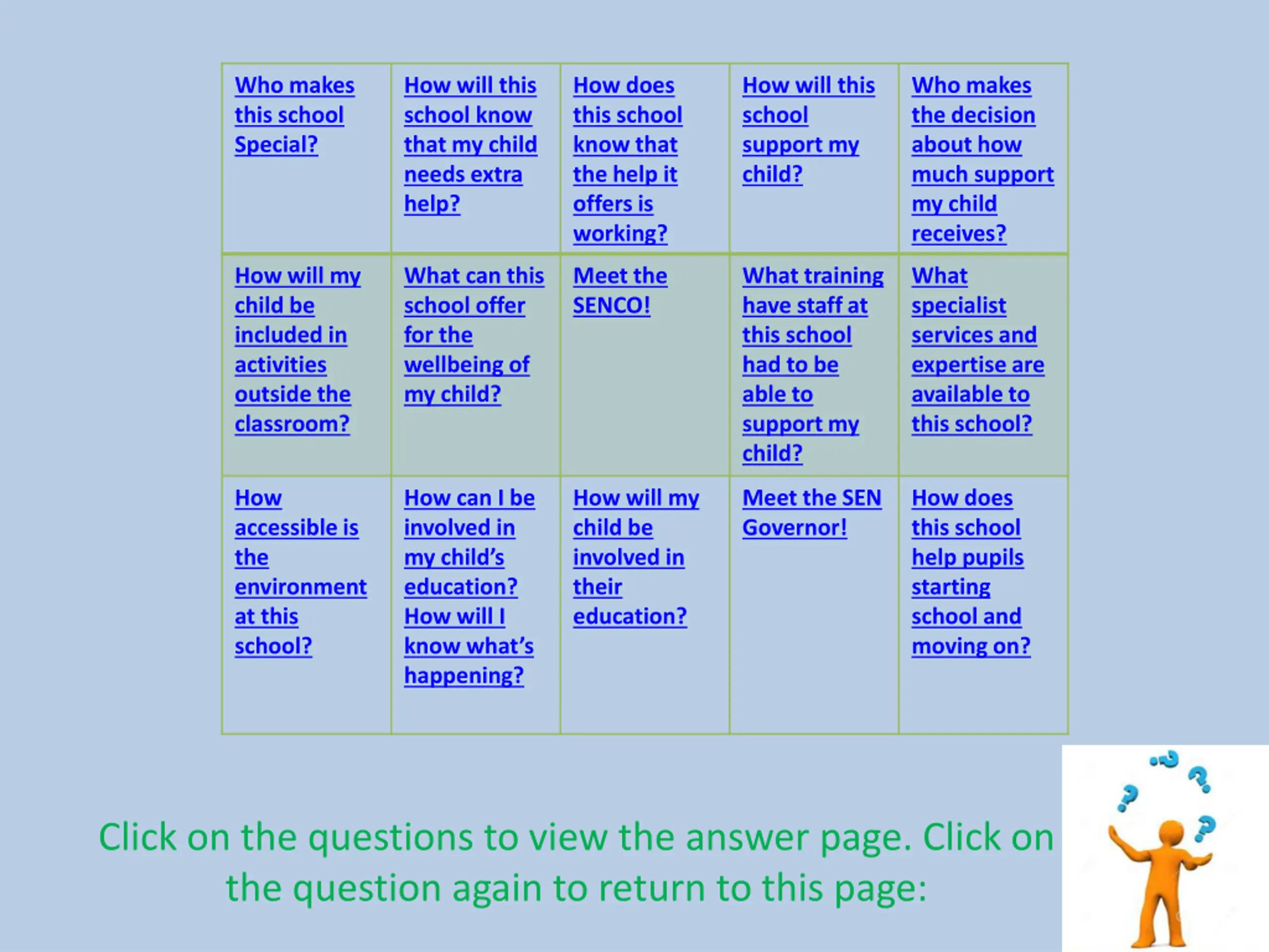 Who makes this school Special? How will this school know that my child needs extra help? How does this school know that the help it offers is working? How will this school support my child? Who makes the decision about how much support my child receives? How will my child be included in activities outside the classroom? What can this school offer for the wellbeing of my child? Meet the SENCO! What training have staff at this school had to be able to support my child? What specialist services and expertiseare available to this school? How accessible is the environment at this school? How can I be involved in my child s education? How will I know what s happening? How will my child be involved in their education? Meet the SEN Governor! How does this school help pupils starting school and moving on? Click on the questions to view the answer page. Click on the question again to return to this page: