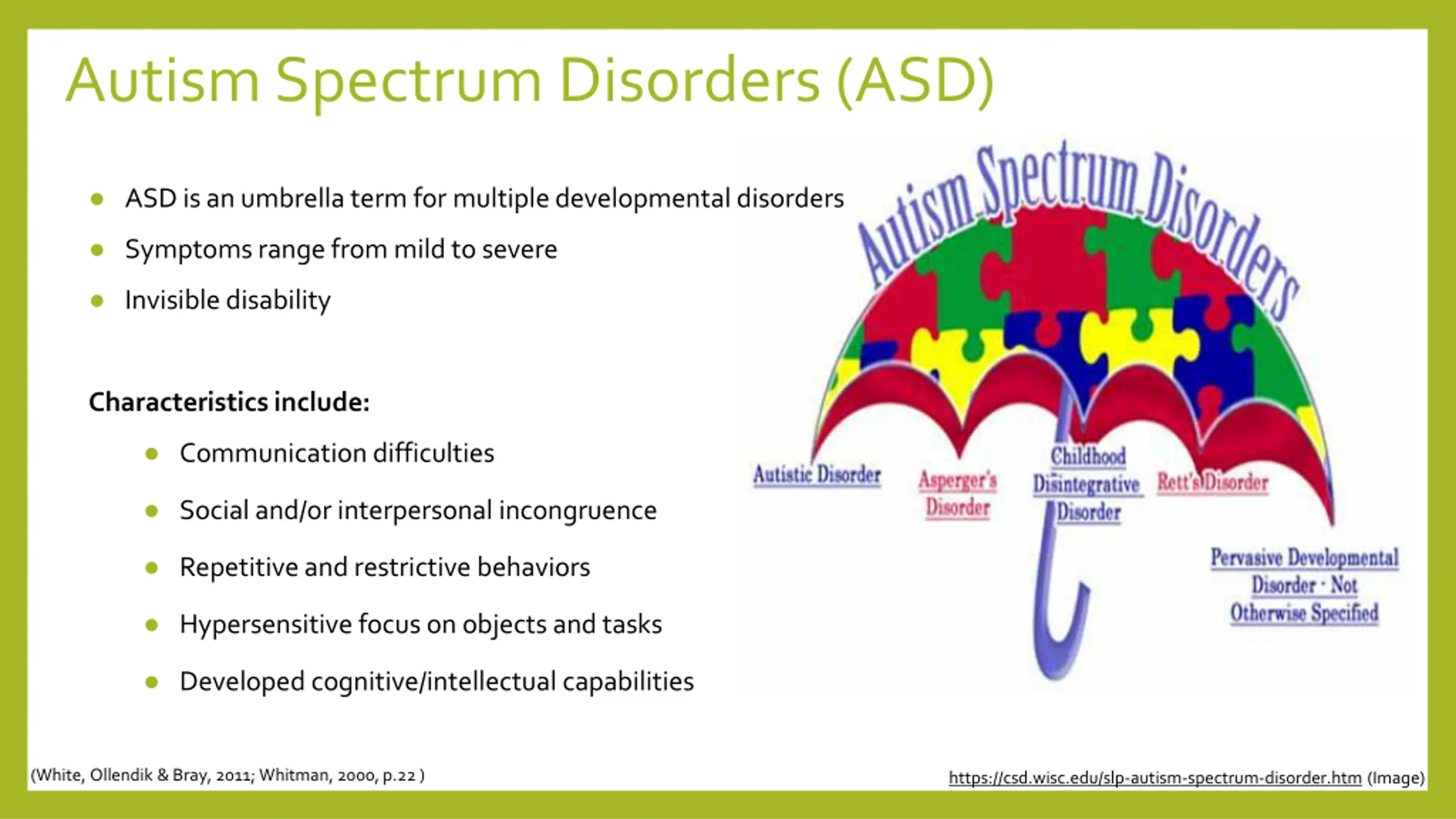 Autism Spectrum Disorders (ASD) ASD is an umbrella term for multiple developmental disorders Symptoms range from mild to severe Invisible disability Characteristics include: Communication difficulties Social and/or interpersonal incongruence Repetitive and restrictive behaviors Hypersensitive focus on objects and tasks Developed cognitive/intellectual capabilities (White, Ollendik & Bray, 2011; Whitman, 2000, p.22 ) https://csd.wisc.edu/slp-autism-spectrum-disorder.htm (Image)