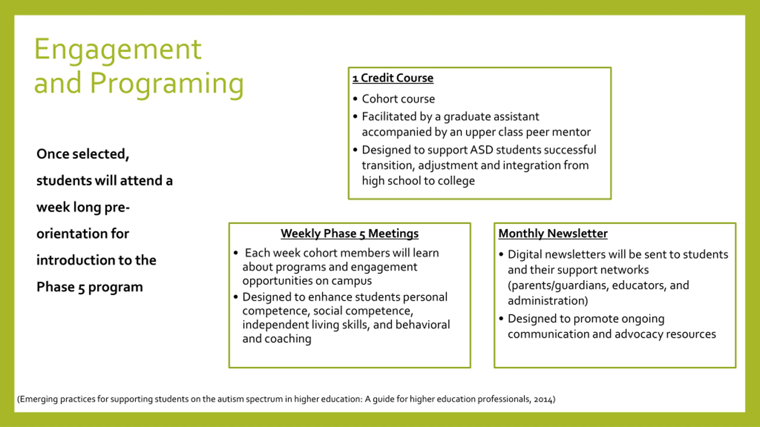 Engagement and Programing 1 Credit Course Cohort course Facilitated by a graduate assistant accompanied by an upper class peer mentor Designed to support ASD students successful transition, adjustment and integration from high school to college Once selected, students will attend a week longpre- orientation for Weekly Phase 5 Meetings Monthly Newsletter Each week cohort members will learn about programs and engagement opportunities on campus Designed to enhance students personal competence, social competence, independent living skills, and behavioral and coaching Digital newsletters will be sent to students and their support networks (parents/guardians, educators, and administration) Designed to promote ongoing communication and advocacyresources introduction to the Phase 5 program (Emerging practices for supporting students on the autism spectrum in higher education: A guide for higher education professionals, 2014)