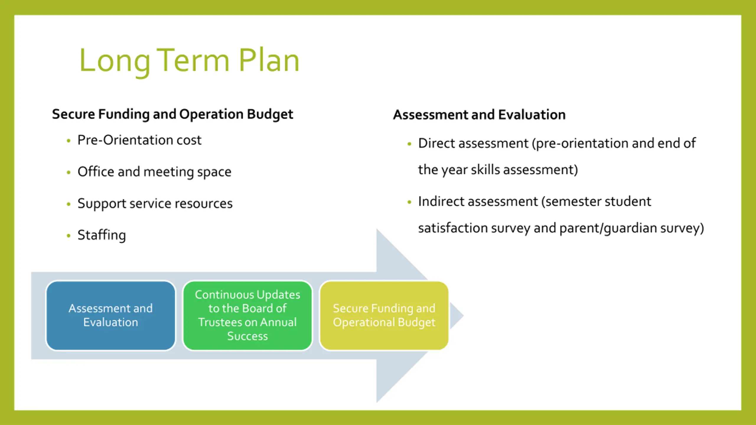 Long Term Plan Secure Funding and Operation Budget Assessment and Evaluation Pre-Orientation cost Direct assessment (pre-orientation and end of the year skills assessment) Office and meeting space Indirect assessment (semester student Support service resources satisfaction survey and parent/guardian survey) Staffing Continuous Updates to the Board of Trustees on Annual Success Assessment and Evaluation Secure Funding and Operational Budget