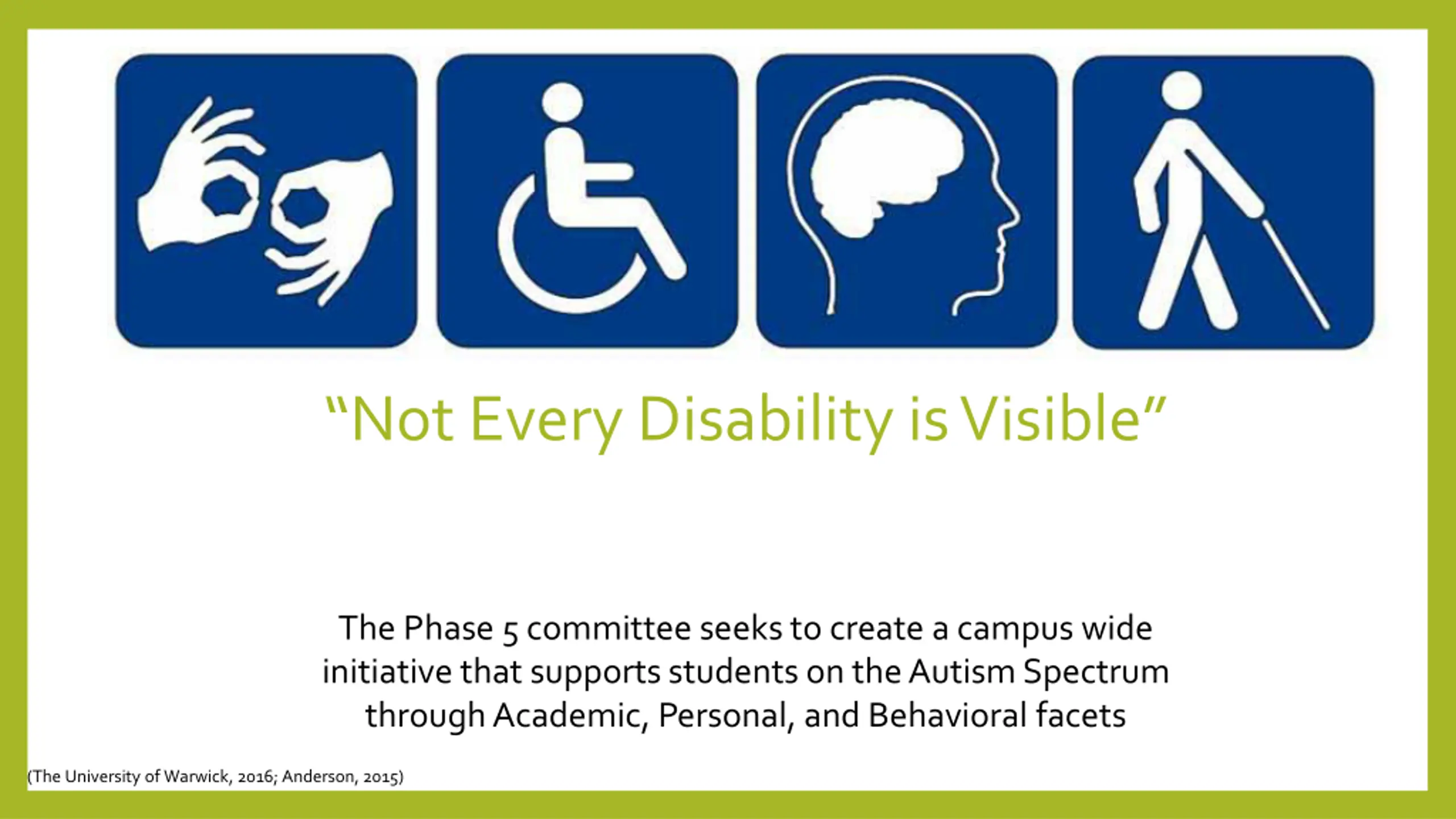 Not Every Disability is Visible The Phase 5 committee seeks to create a campus wide initiative that supports students on the Autism Spectrum through Academic, Personal, and Behavioral facets (The University of Warwick, 2016; Anderson, 2015)