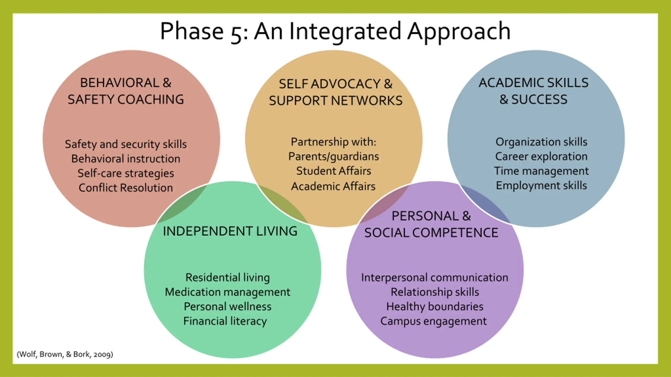 Phase 5: An Integrated Approach BEHAVIORAL & SAFETY COACHING ACADEMIC SKILLS & SUCCESS SELF ADVOCACY & SUPPORT NETWORKS Partnership with: Parents/guardians Student Affairs Academic Affairs Organization skills Career exploration Time management Employment skills Safety and security skills Behavioral instruction Self-care strategies Conflict Resolution PERSONAL& SOCIAL COMPETENCE INDEPENDENT LIVING Residential living Medication management Personal wellness Financial literacy Interpersonal communication Relationship skills Healthy boundaries Campus engagement (Wolf, Brown, & Bork, 2009)