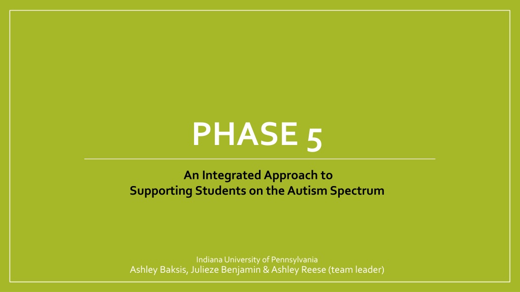 PHASE 5 An Integrated Approach to Supporting Students on the Autism Spectrum Indiana Universityof Pennsylvania Ashley Baksis, Julieze Benjamin & Ashley Reese (team leader)