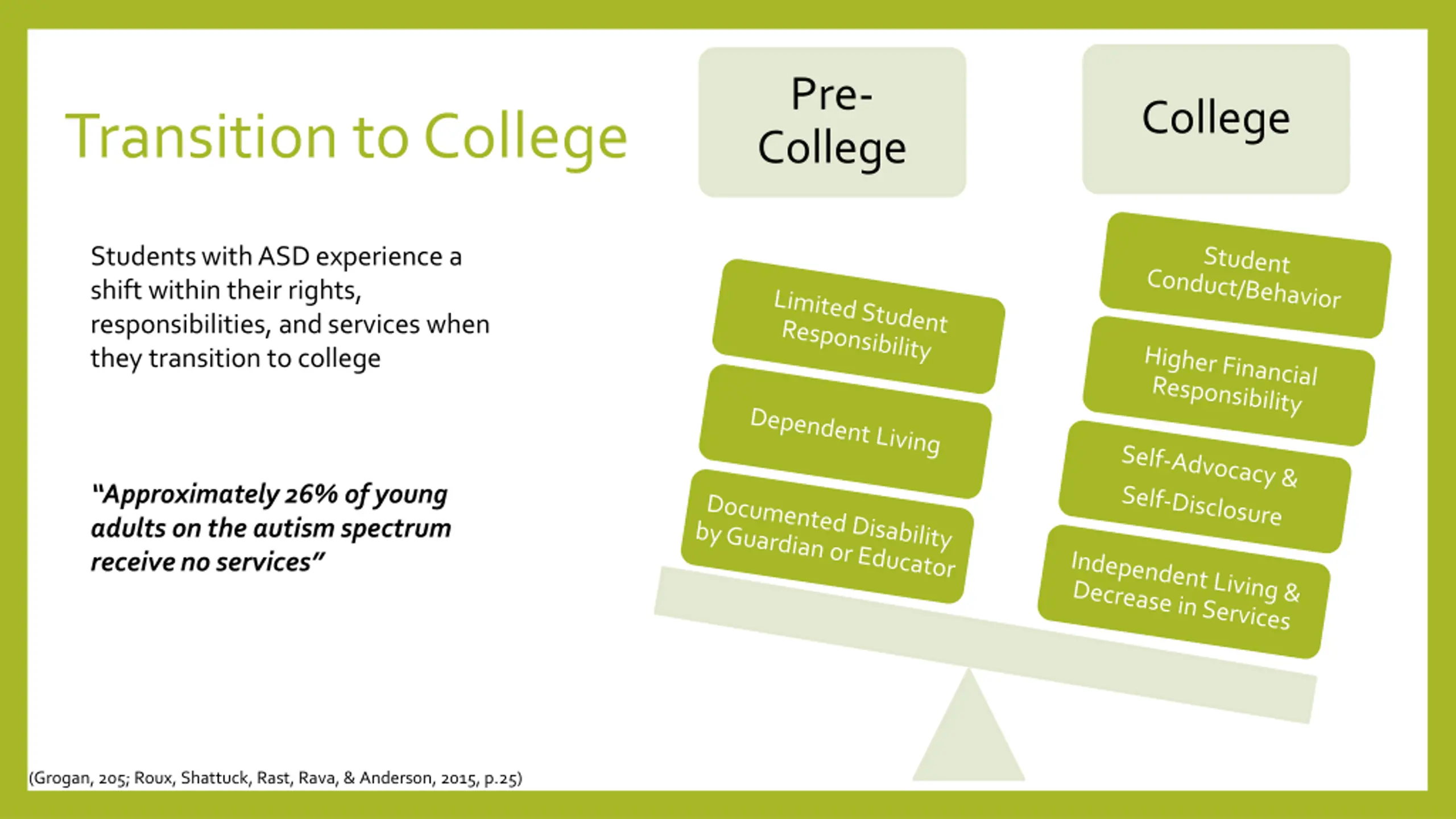 Pre- College College Transition to College Students with ASD experience a shift within their rights, responsibilities, and services when they transition to college Approximately 26% of young adults on the autism spectrum receive no services (Grogan, 205; Roux, Shattuck, Rast, Rava, & Anderson, 2015, p.25)