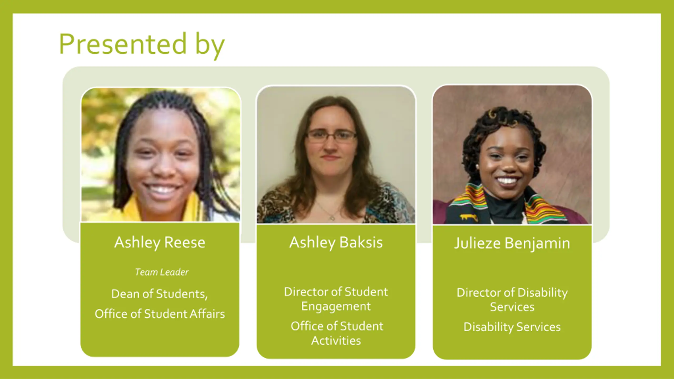 Presented by Ashley Baksis Ashley Reese Julieze Benjamin Team Leader Director of Student Engagement Director of Disability Services Dean of Students, Office of Student Affairs Office of Student Activities Disability Services