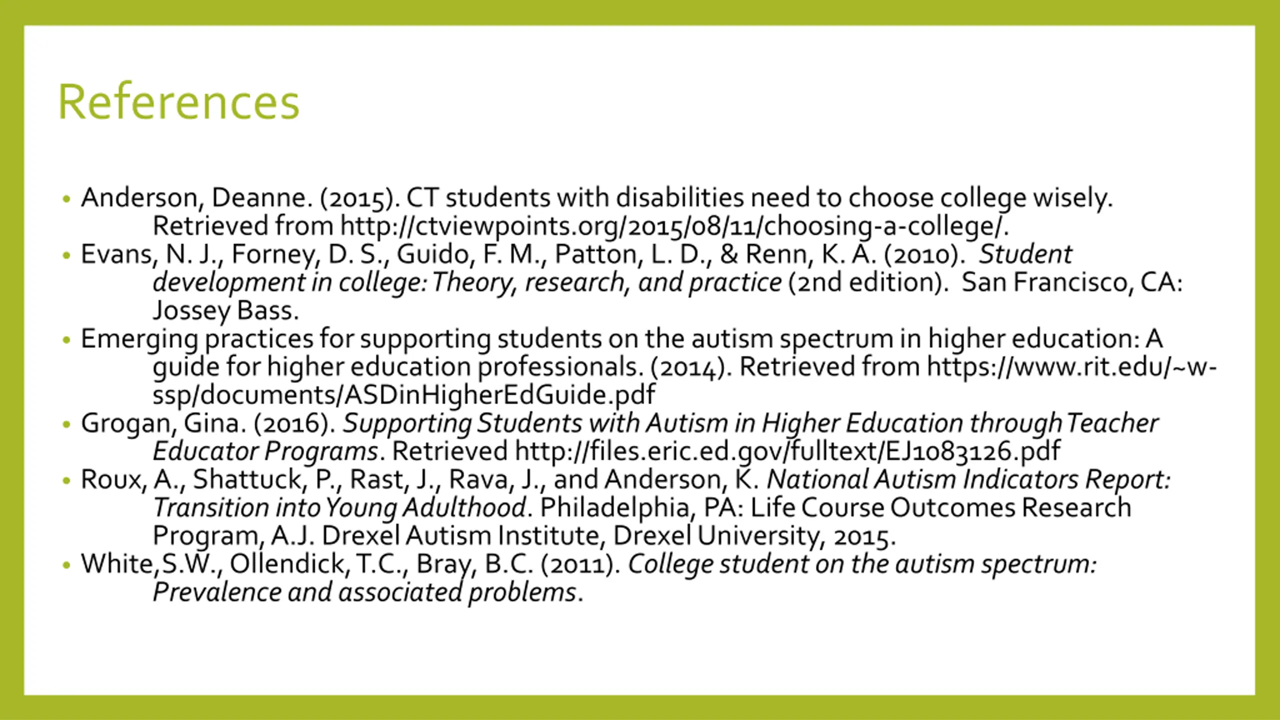 References Anderson, Deanne. (2015). CT students with disabilities need to choose college wisely. Retrieved from http://ctviewpoints.org/2015/08/11/choosing-a-college/. Evans, N. J., Forney, D. S., Guido, F. M., Patton, L. D., & Renn, K. A. (2010). Student development in college: Theory, research, and practice (2nd edition). San Francisco, CA: Jossey Bass. Emerging practices for supporting students on the autism spectrum in higher education: A guide for higher education professionals. (2014). Retrieved from https://www.rit.edu/~w- ssp/documents/ASDinHigherEdGuide.pdf Grogan, Gina. (2016). Supporting Students with Autism in Higher Education through Teacher Educator Programs. Retrieved http://files.eric.ed.gov/fulltext/EJ1083126.pdf Roux, A., Shattuck, P., Rast, J., Rava, J., and Anderson, K. National Autism Indicators Report: Transition into Young Adulthood. Philadelphia, PA: Life Course Outcomes Research Program, A.J. Drexel Autism Institute, Drexel University, 2015. White,S.W., Ollendick, T.C., Bray, B.C. (2011). College student on the autism spectrum: Prevalence and associated problems.
