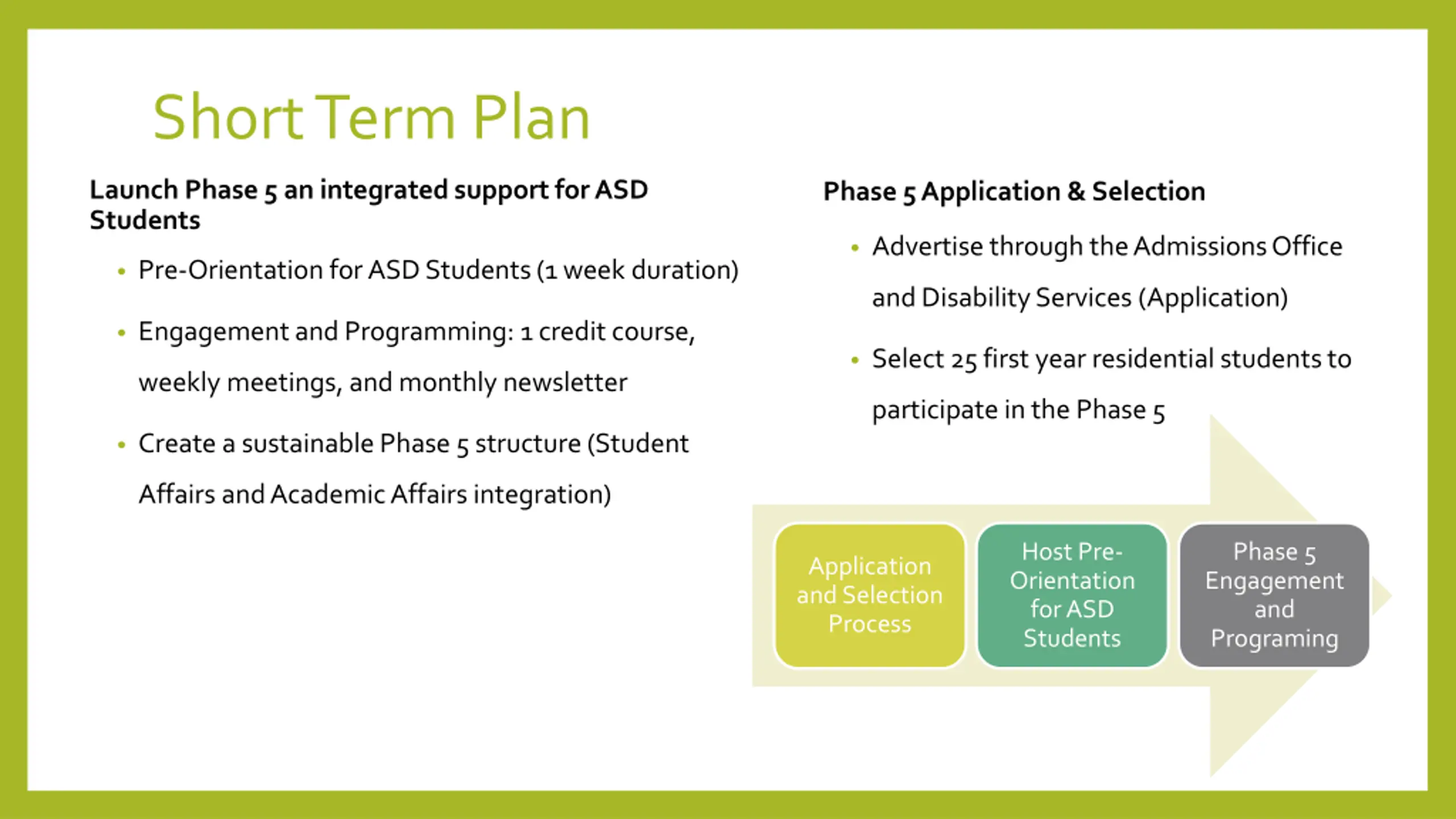 Short Term Plan Launch Phase 5 an integrated support for ASD Students Phase 5 Application & Selection Advertise through the Admissions Office Pre-Orientation for ASD Students (1 week duration) and Disability Services (Application) Engagement and Programming: 1 credit course, Select 25 first year residential students to weekly meetings, and monthly newsletter participate in the Phase 5 Create a sustainable Phase 5 structure (Student Affairs and Academic Affairs integration) Host Pre- Orientation for ASD Students Phase 5 Engagement and Programing Application and Selection Process