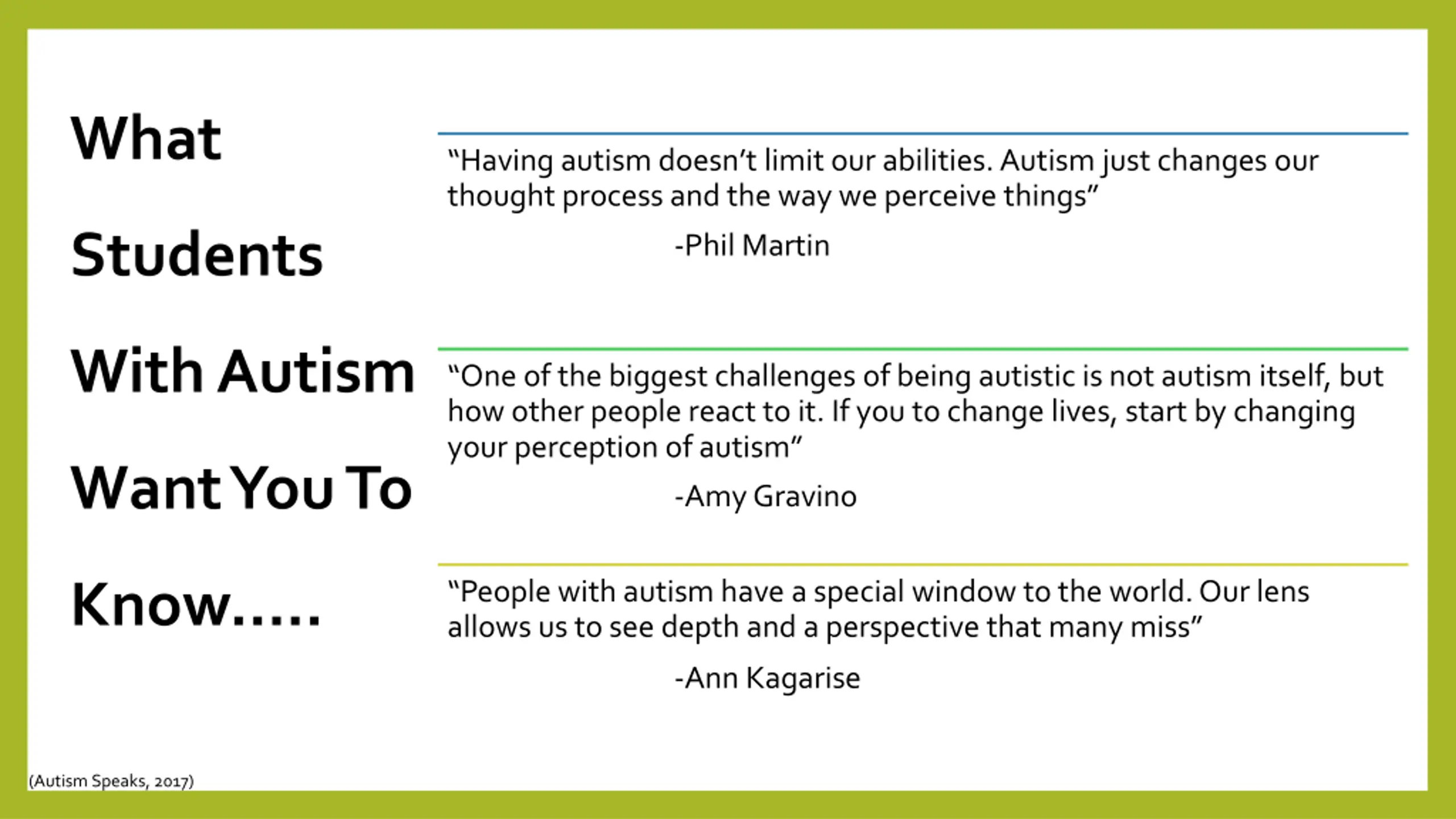 What Having autism doesn t limit our abilities. Autism just changes our thought process and the way we perceive things Students -Phil Martin With Autism One of the biggest challenges of being autistic is not autism itself, but how other people react to it. If you to change lives, start by changing your perception of autism Want You To -Amy Gravino Know .. People with autism have a special window to the world. Our lens allows us to see depth and a perspective that many miss -Ann Kagarise (Autism Speaks, 2017)