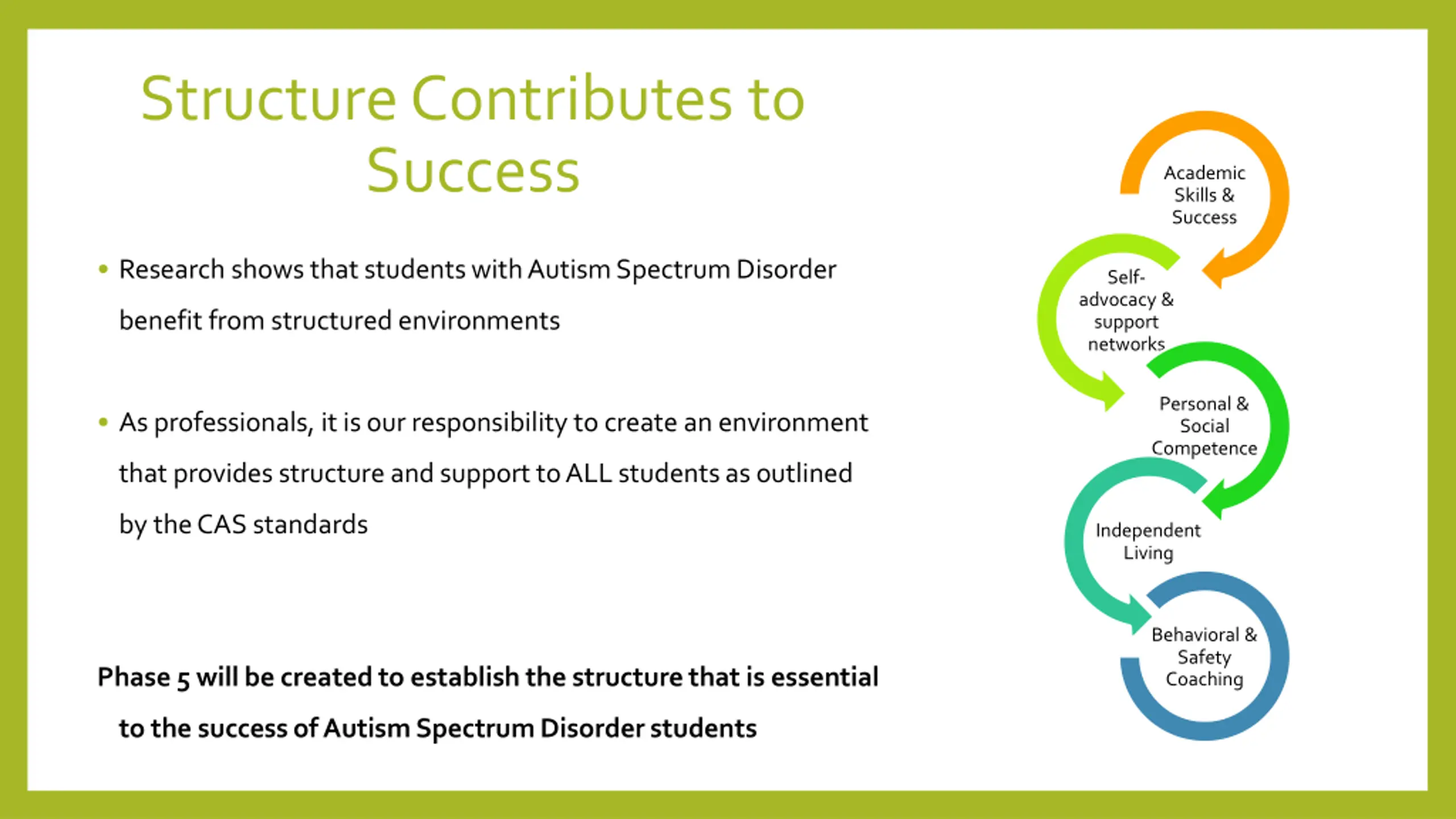 Structure Contributes to Success Academic Skills & Success Research shows that students with Autism Spectrum Disorder Self- advocacy & support networks benefit from structured environments Personal & Social Competence As professionals, it is our responsibility to create an environment that provides structure and support to ALL students as outlined by the CAS standards Independent Living Behavioral & Safety Coaching Phase 5 will be created to establish the structure that is essential to the success of Autism Spectrum Disorder students