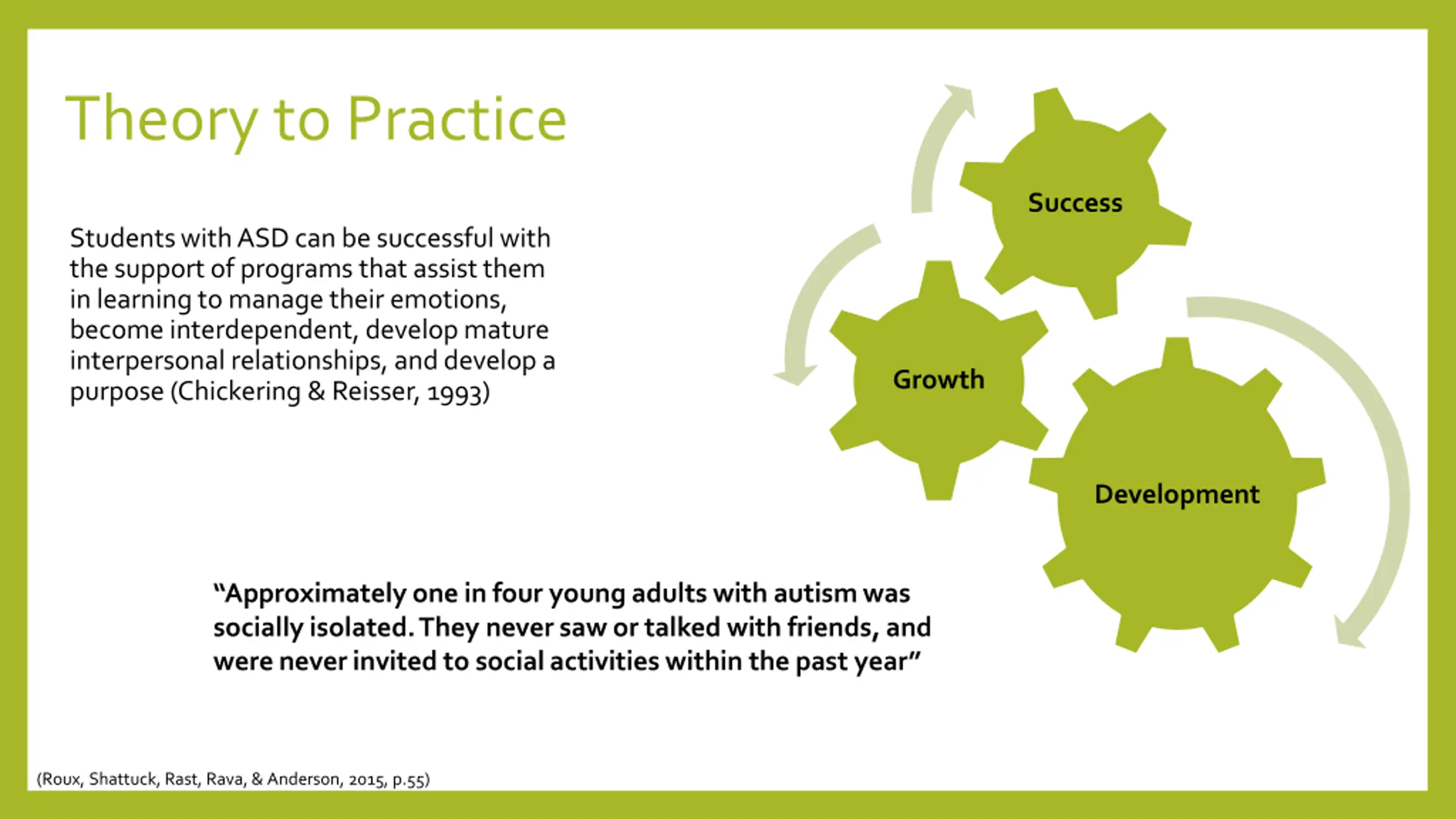 Theory to Practice Success Students with ASD can be successful with the support of programs that assist them in learning to manage their emotions, become interdependent, develop mature interpersonal relationships, and develop a purpose (Chickering & Reisser, 1993) Growth Development Approximately one in four young adults with autism was socially isolated. They never saw or talked with friends, and were never invited to social activities within the past year (Roux, Shattuck, Rast, Rava, & Anderson, 2015, p.55)