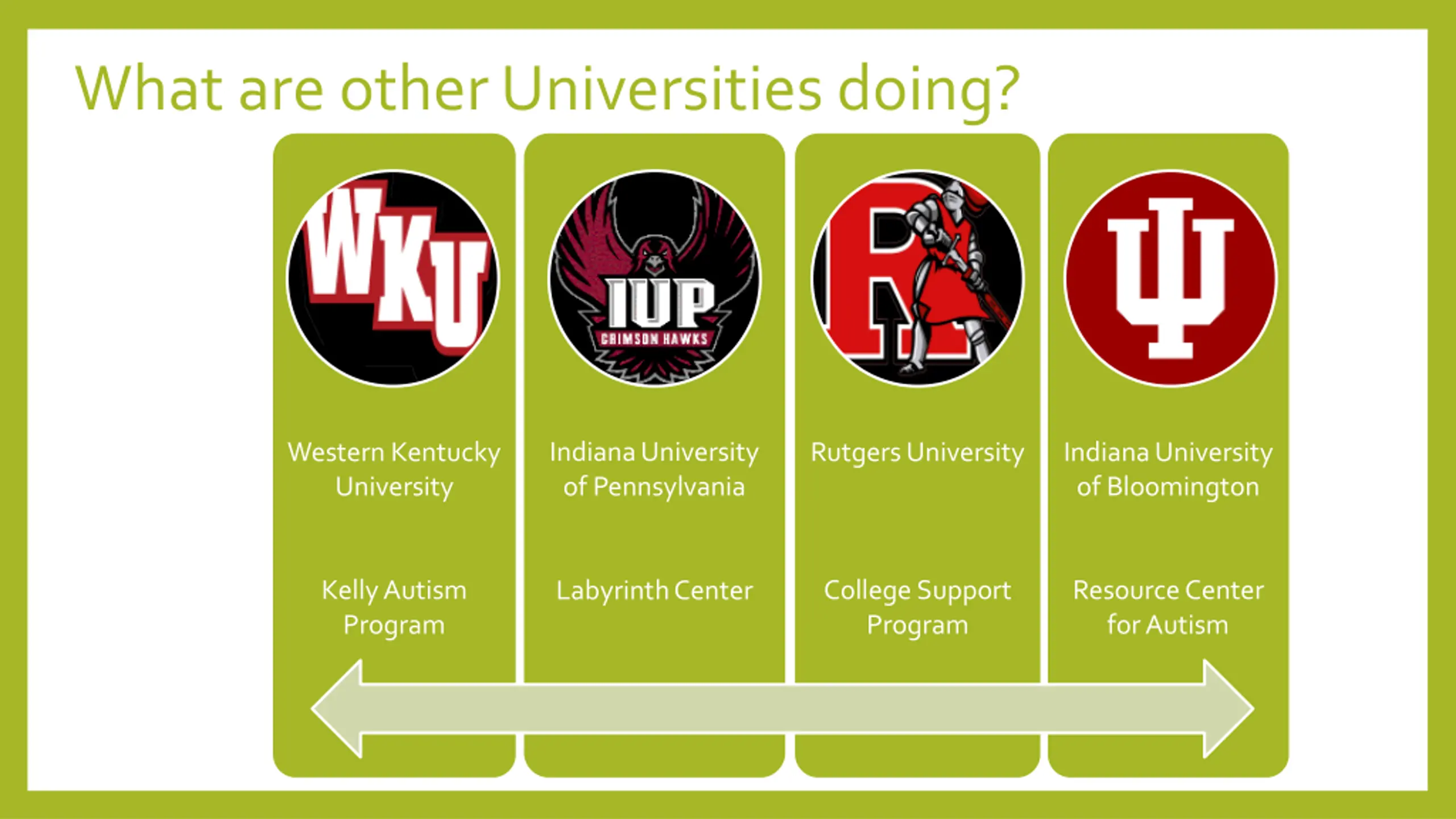 What are other Universities doing? Indiana University of Pennsylvania Western Kentucky University Rutgers University Indiana University of Bloomington Kelly Autism Program College Support Program Resource Center for Autism Labyrinth Center