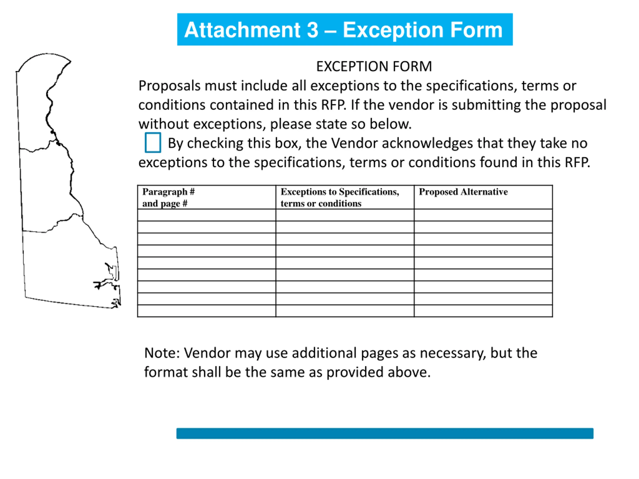 Attachment 3 Exception Form EXCEPTION FORM Proposals must include all exceptions to the specifications, terms or conditions contained in this RFP. If the vendor is submitting the proposal without exceptions, please state so below. By checking this box, the Vendor acknowledges that they take no exceptions to the specifications, terms or conditions found in this RFP. Paragraph # and page # terms or conditions Exceptions to Specifications, Proposed Alternative Note: Vendor may use additional pages as necessary, but the format shall be the same as provided above.