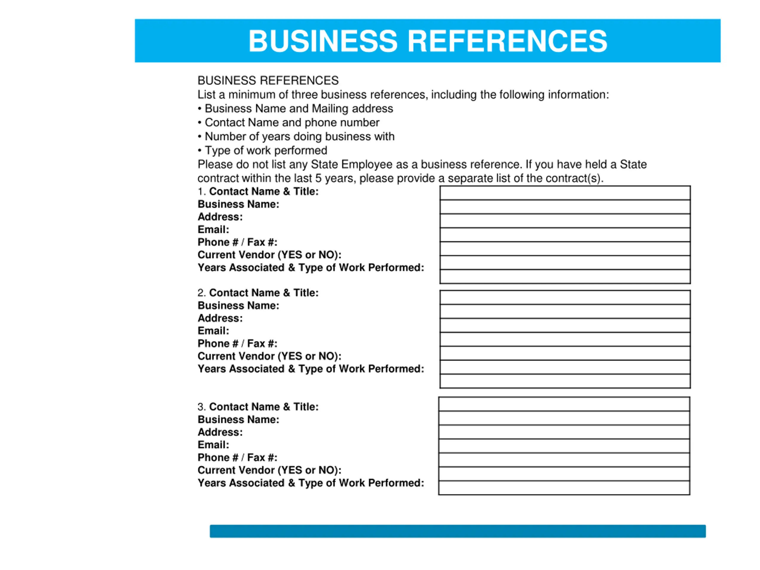 BUSINESS REFERENCES BUSINESS REFERENCES List a minimum of three business references, including the following information: Business Name and Mailing address Contact Name and phone number Number of years doing business with Type of work performed Please do not list any State Employee as a business reference. If you have held a State contract within the last 5 years, please provide a separate list of the contract(s). 1. Contact Name & Title: Business Name: Address: Email: Phone # / Fax #: Current Vendor (YES or NO): Years Associated & Type of Work Performed: 2. Contact Name & Title: Business Name: Address: Email: Phone # / Fax #: Current Vendor (YES or NO): Years Associated & Type of Work Performed: 3. Contact Name & Title: Business Name: Address: Email: Phone # / Fax #: Current Vendor (YES or NO): Years Associated & Type of Work Performed: