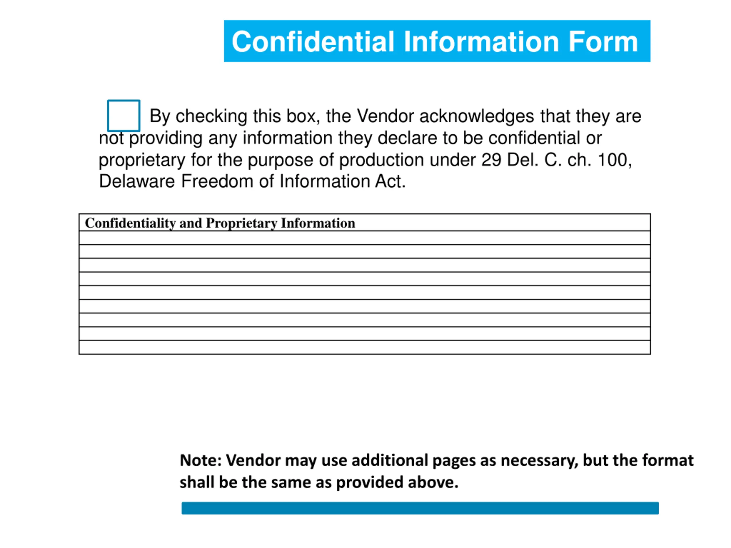 Confidential Information Form By checking this box, the Vendor acknowledges that they are not providing any information they declare to be confidential or proprietary for the purpose of production under 29 Del. C. ch. 100, Delaware Freedom of Information Act. Confidentiality and Proprietary Information Note: Vendor may use additional pages as necessary, but the format shall be the same as provided above.
