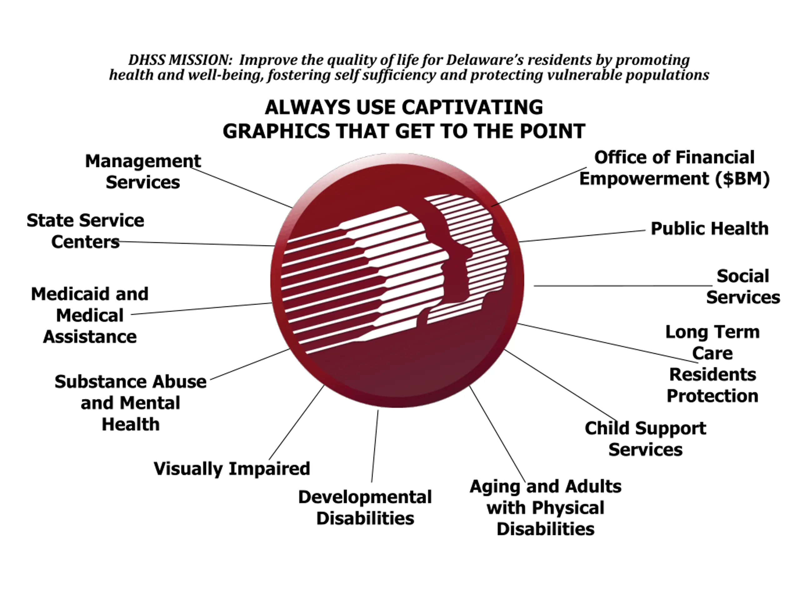 DHSS MISSION: Improve the quality of life for Delawares residents by promoting health and well-being, fostering self sufficiency and protecting vulnerable populations ALWAYS USE CAPTIVATING GRAPHICS THAT GET TO THE POINT Office of Financial Empowerment ($BM) Management Services State Service Centers Public Health Social Services Medicaid and Medical Assistance Long Term Care Residents Protection Substance Abuse and Mental Health Child Support Services Visually Impaired Aging and Adults with Physical Disabilities Developmental Disabilities