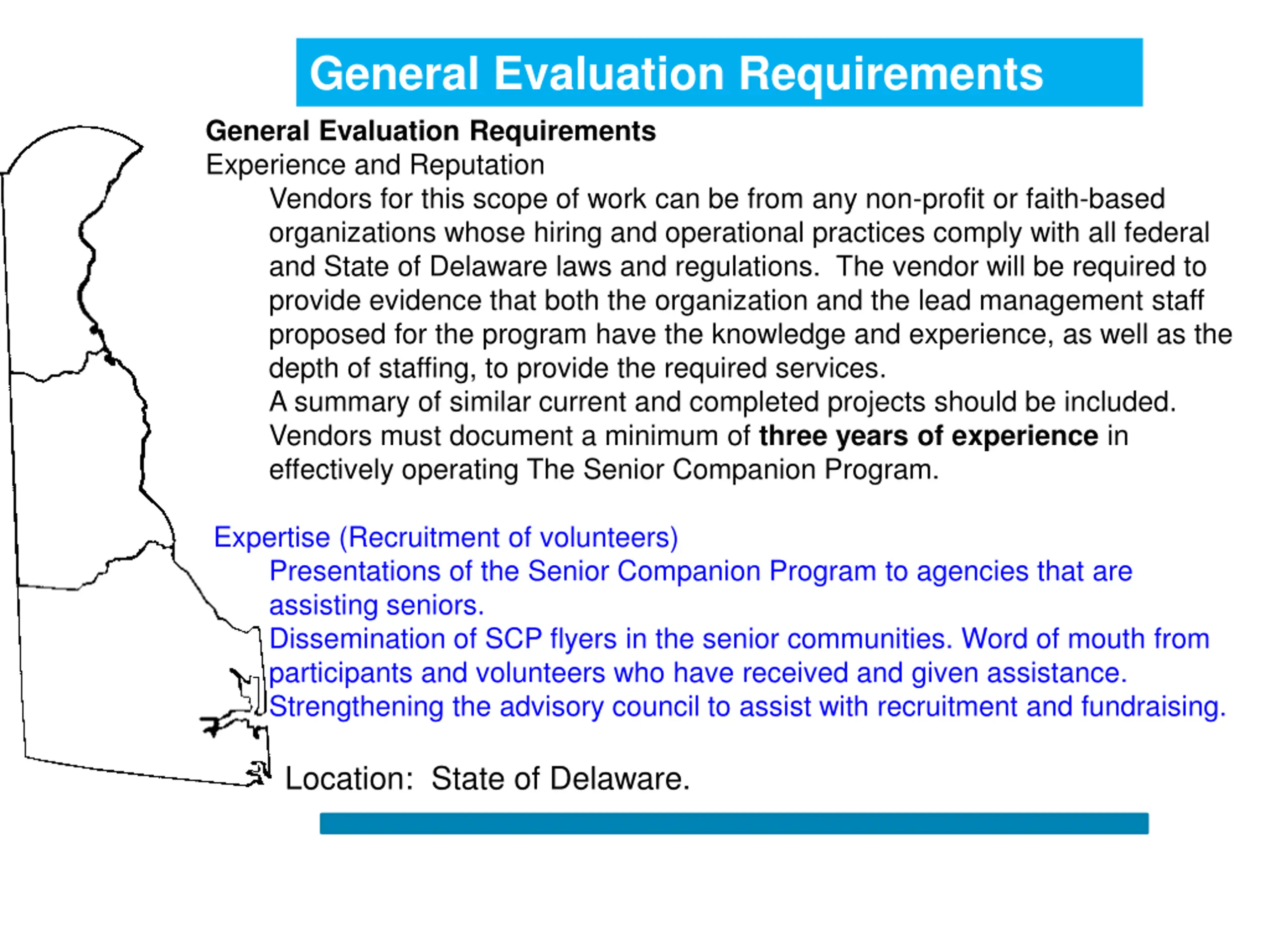 General Evaluation Requirements General Evaluation Requirements Experience and Reputation Vendors for this scope of work can be from any non-profit or faith-based organizations whose hiring and operational practices comply with all federal and State of Delaware laws and regulations. The vendor will be required to provide evidence that both the organization and the lead management staff proposed for the program have the knowledge and experience, as well as the depth of staffing, to provide the required services. A summary of similar current and completed projects should be included. Vendors must document a minimum of three years of experience in effectively operating The Senior Companion Program. Expertise (Recruitment of volunteers) Presentations of the Senior Companion Program to agencies that are assisting seniors. Dissemination of SCP flyers in the senior communities. Word of mouth from participants and volunteers who have received and given assistance. Strengthening the advisory council to assist with recruitment and fundraising. Location: State of Delaware.