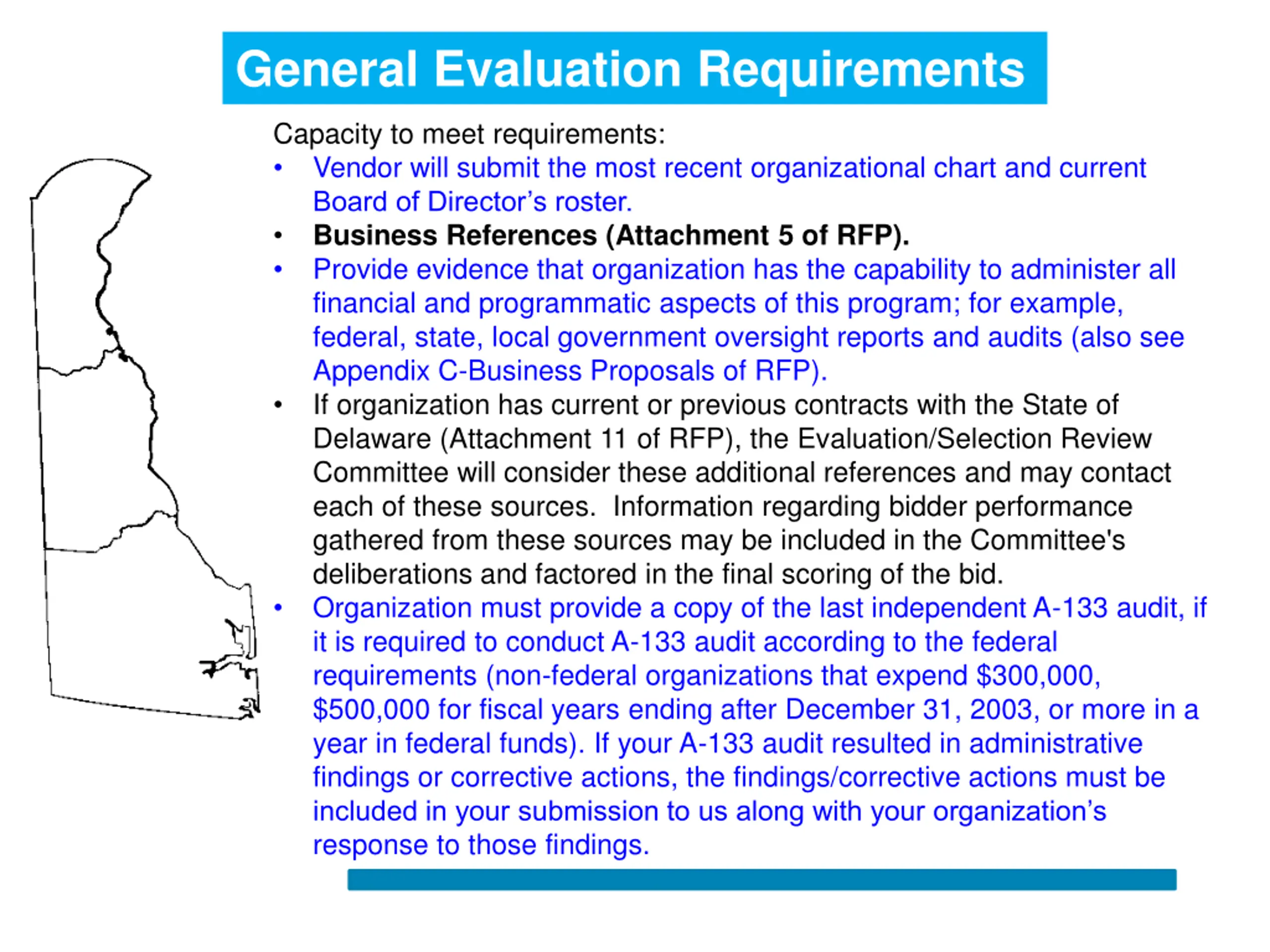 General Evaluation Requirements Capacity to meet requirements: Vendor will submit the most recent organizational chart and current Board of Director s roster. Business References (Attachment 5 of RFP). Provide evidence that organization has the capability to administer all financial and programmatic aspects of this program; for example, federal, state, local government oversight reports and audits (also see Appendix C-Business Proposals of RFP). If organization has current or previous contracts with the State of Delaware (Attachment 11 of RFP), the Evaluation/Selection Review Committee will consider these additional references and may contact each of these sources. Information regarding bidder performance gathered from these sources may be included in the Committee's deliberations and factored in the final scoring of the bid. Organization must provide a copy of the last independent A-133 audit, if it is required to conduct A-133 audit according to the federal requirements (non-federal organizations that expend $300,000, $500,000 for fiscal years ending after December 31, 2003, or more in a year in federal funds). If your A-133 audit resulted in administrative findings or corrective actions, the findings/corrective actions must be included in your submission to us along with your organization s response to those findings.
