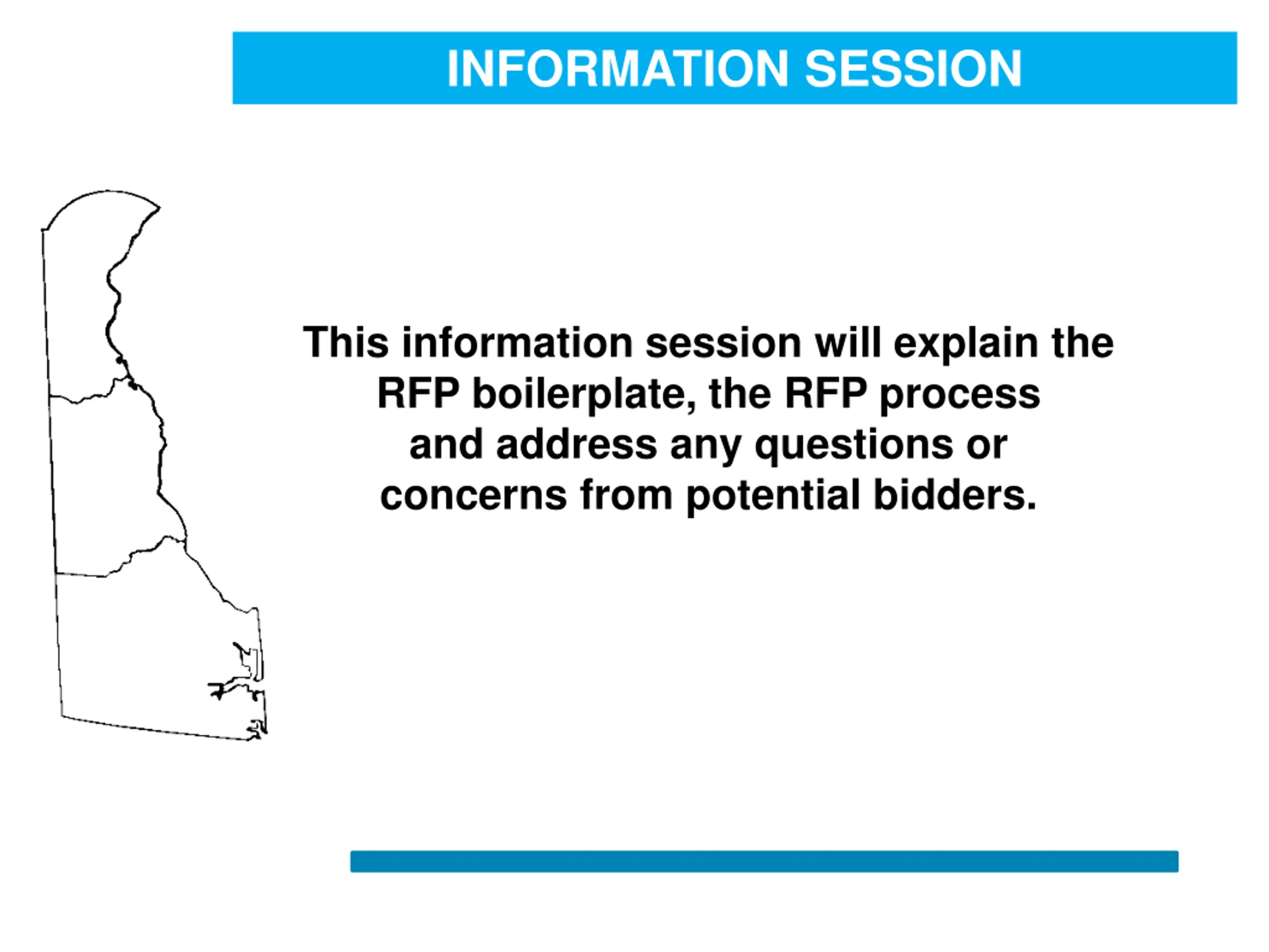 INFORMATION SESSION This information session will explain the RFP boilerplate, the RFP process and address any questions or concerns from potential bidders.
