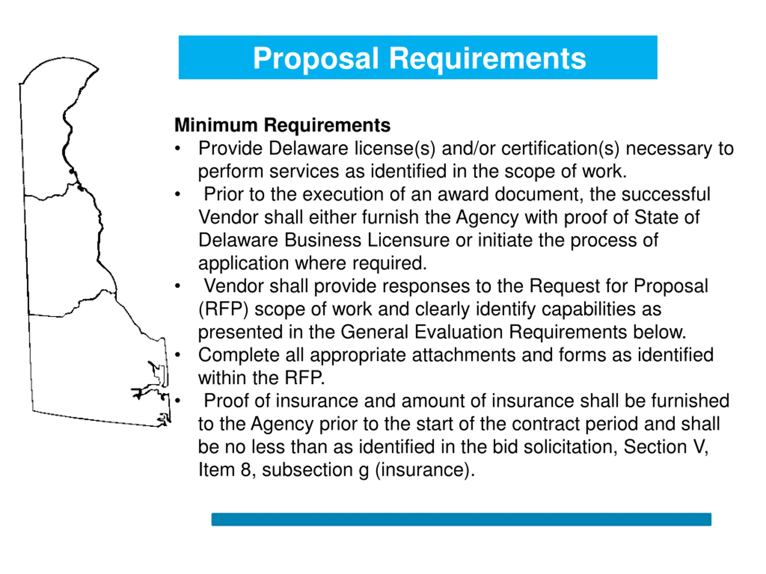 Proposal Requirements Minimum Requirements Provide Delaware license(s) and/or certification(s) necessary to perform services as identified in the scope of work. Prior to the execution of an award document, the successful Vendor shall either furnish the Agency with proof of State of Delaware Business Licensure or initiate the process of application where required. Vendor shall provide responses to the Request for Proposal (RFP) scope of work and clearly identify capabilities as presented in the General Evaluation Requirements below. Complete all appropriate attachments and forms as identified within the RFP. Proof of insurance and amount of insurance shall be furnished to the Agency prior to the start of the contract period and shall be no less than as identified in the bid solicitation, Section V, Item 8, subsection g (insurance).