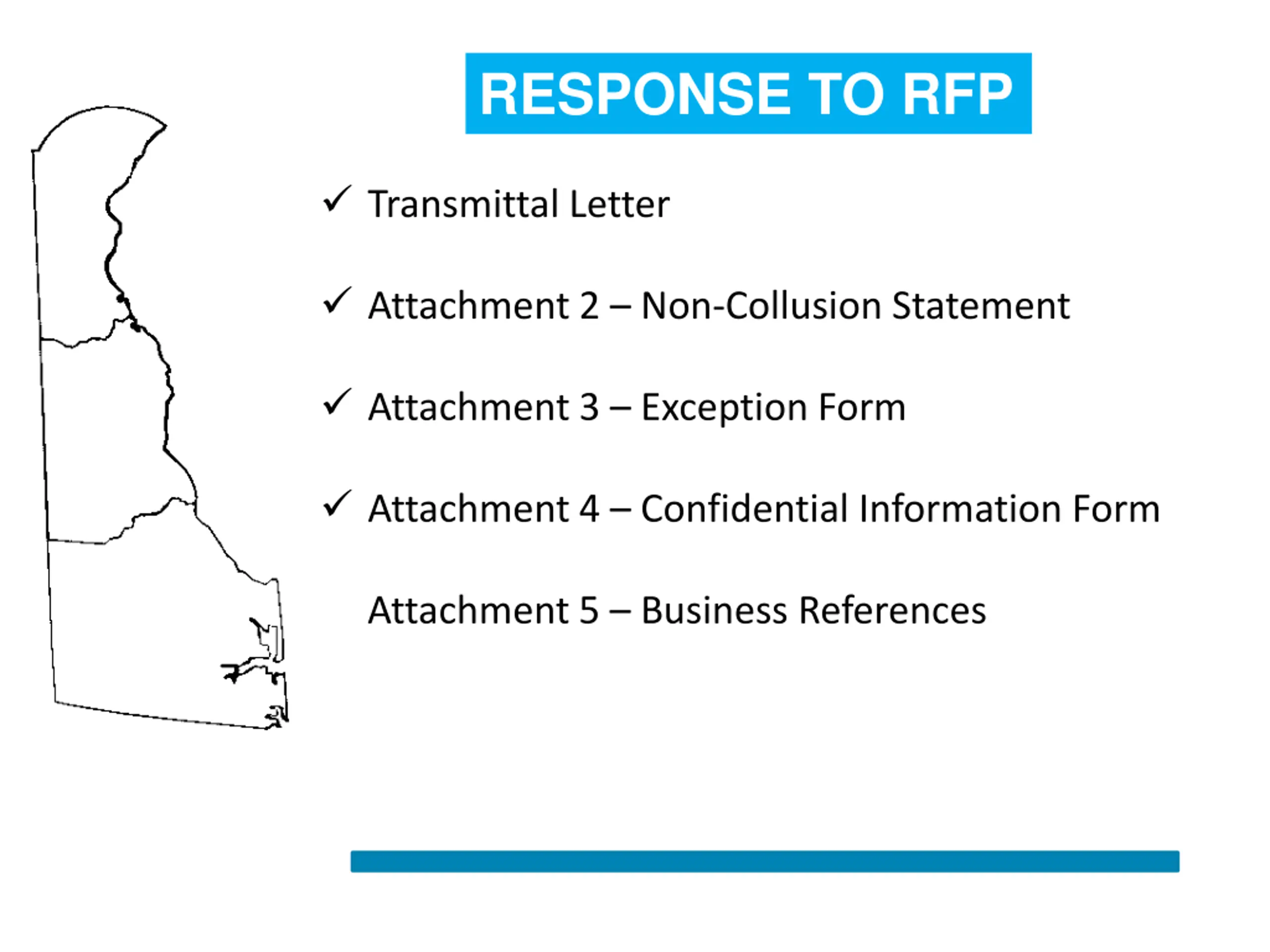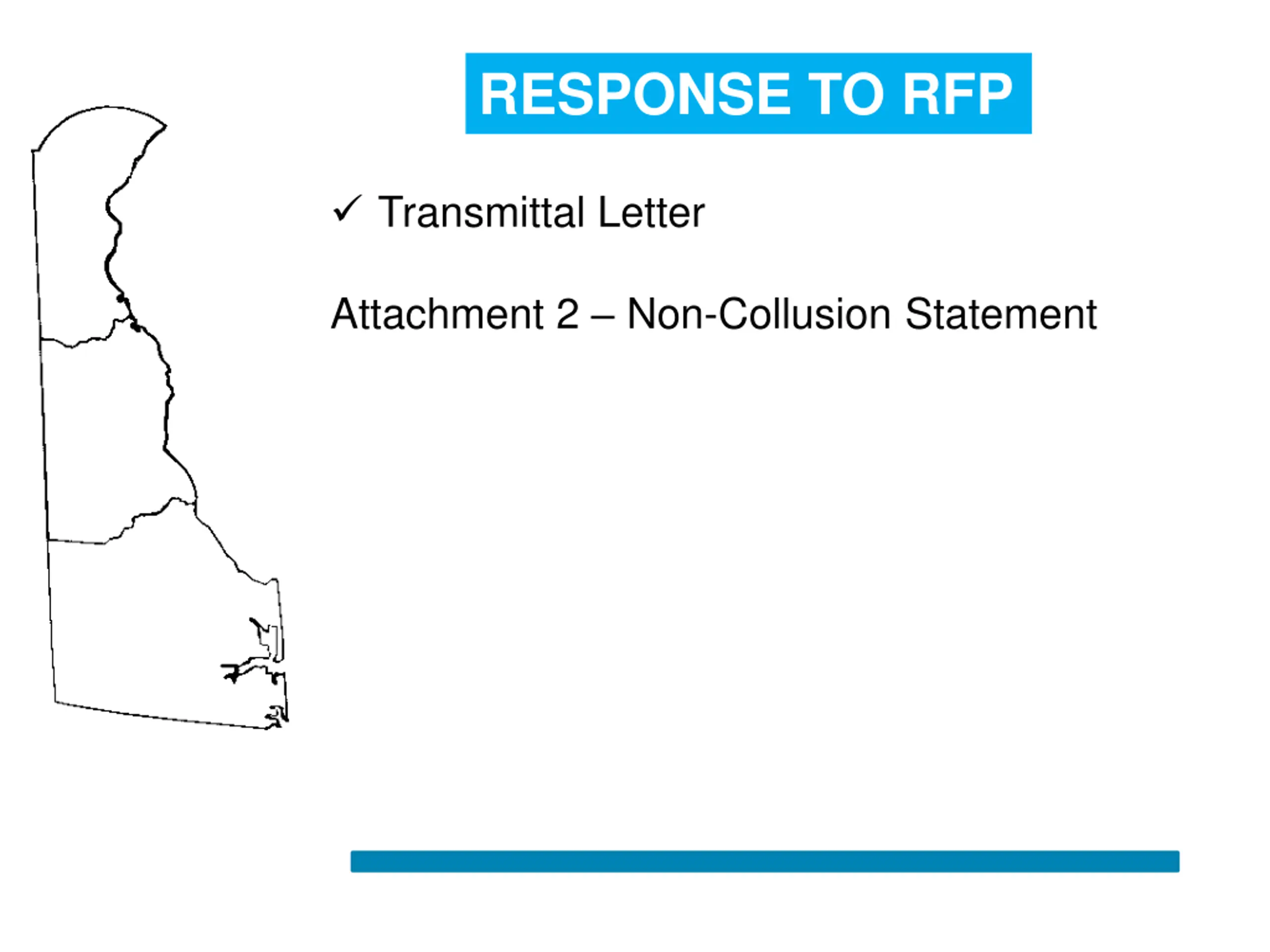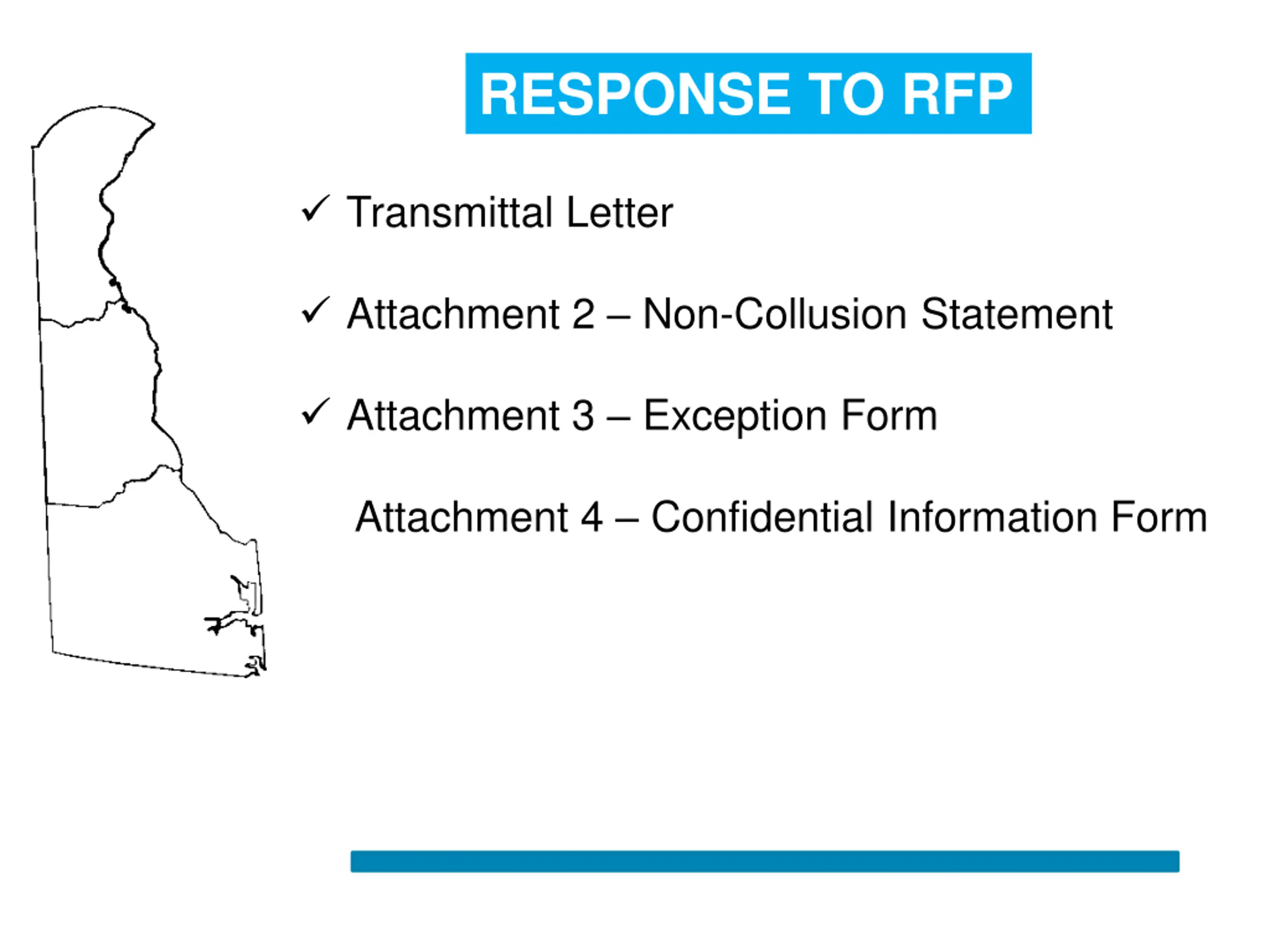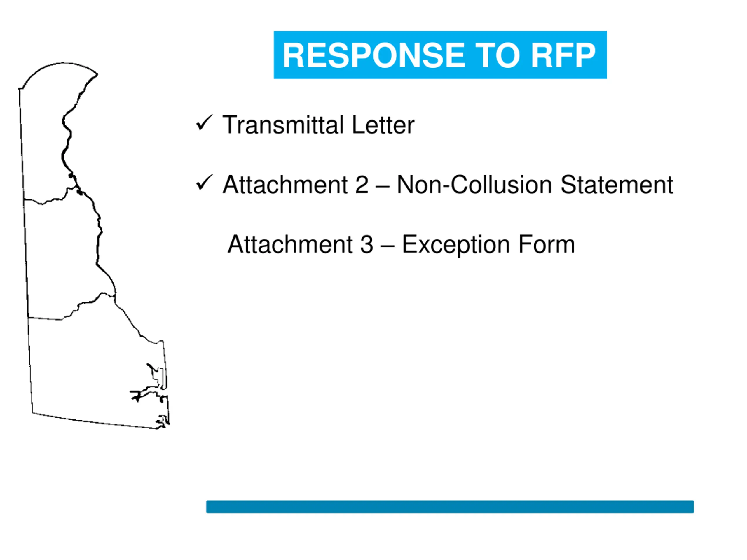 RESPONSE TO RFP Transmittal Letter Attachment 2 Non-Collusion Statement Attachment 3 Exception Form Attachment 4 Confidential Information Form Attachment 5 Business References Proposal and General Evaluation Requirements met?