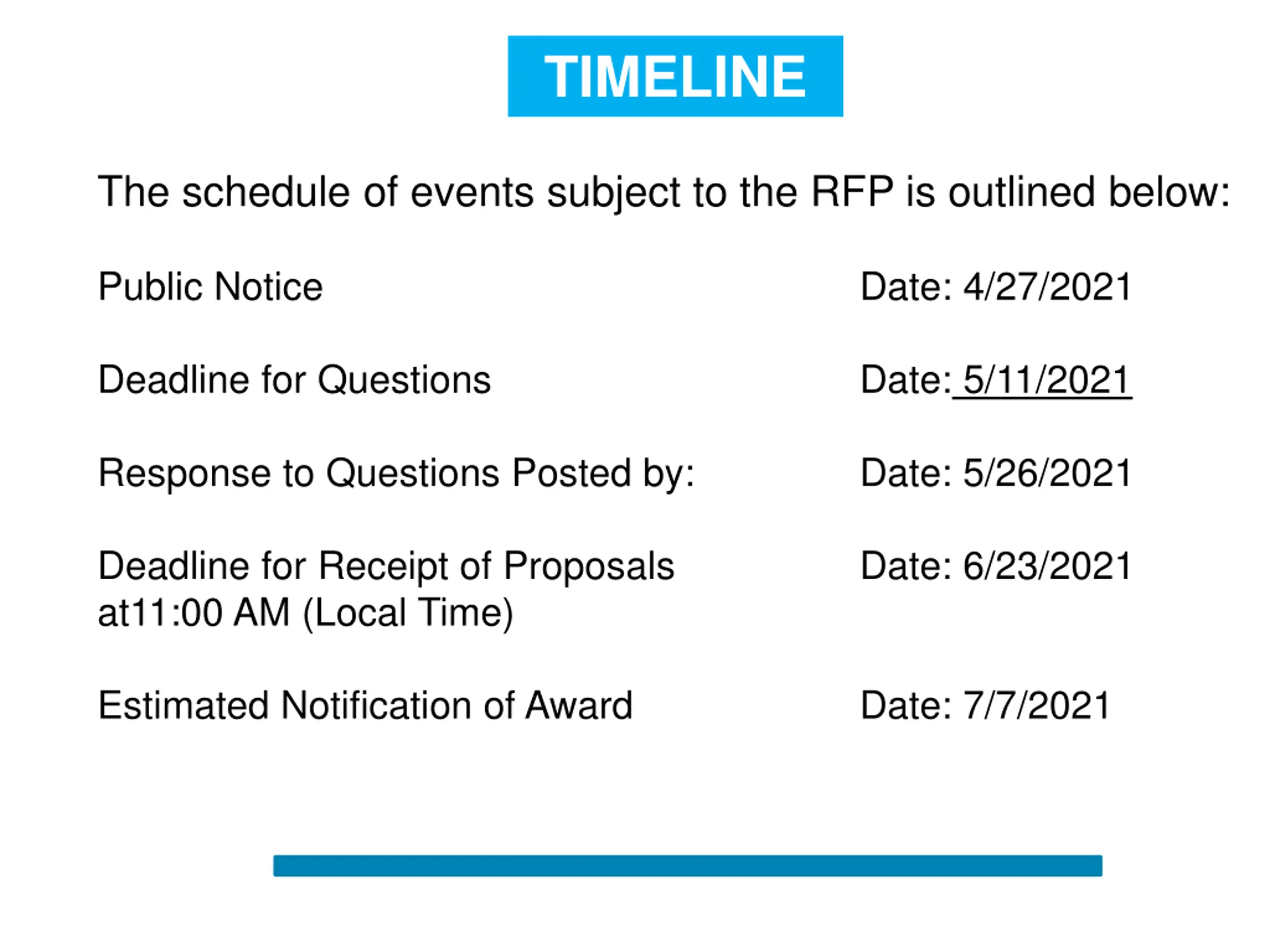 TIMELINE The schedule of events subject to the RFP is outlined below: Public Notice Date: 4/27/2021 Deadline for Questions Date: 5/11/2021 Response to Questions Posted by: Date: 5/26/2021 Deadline for Receipt of Proposals at11:00 AM (Local Time) Date: 6/23/2021 Estimated Notification of Award Date: 7/7/2021